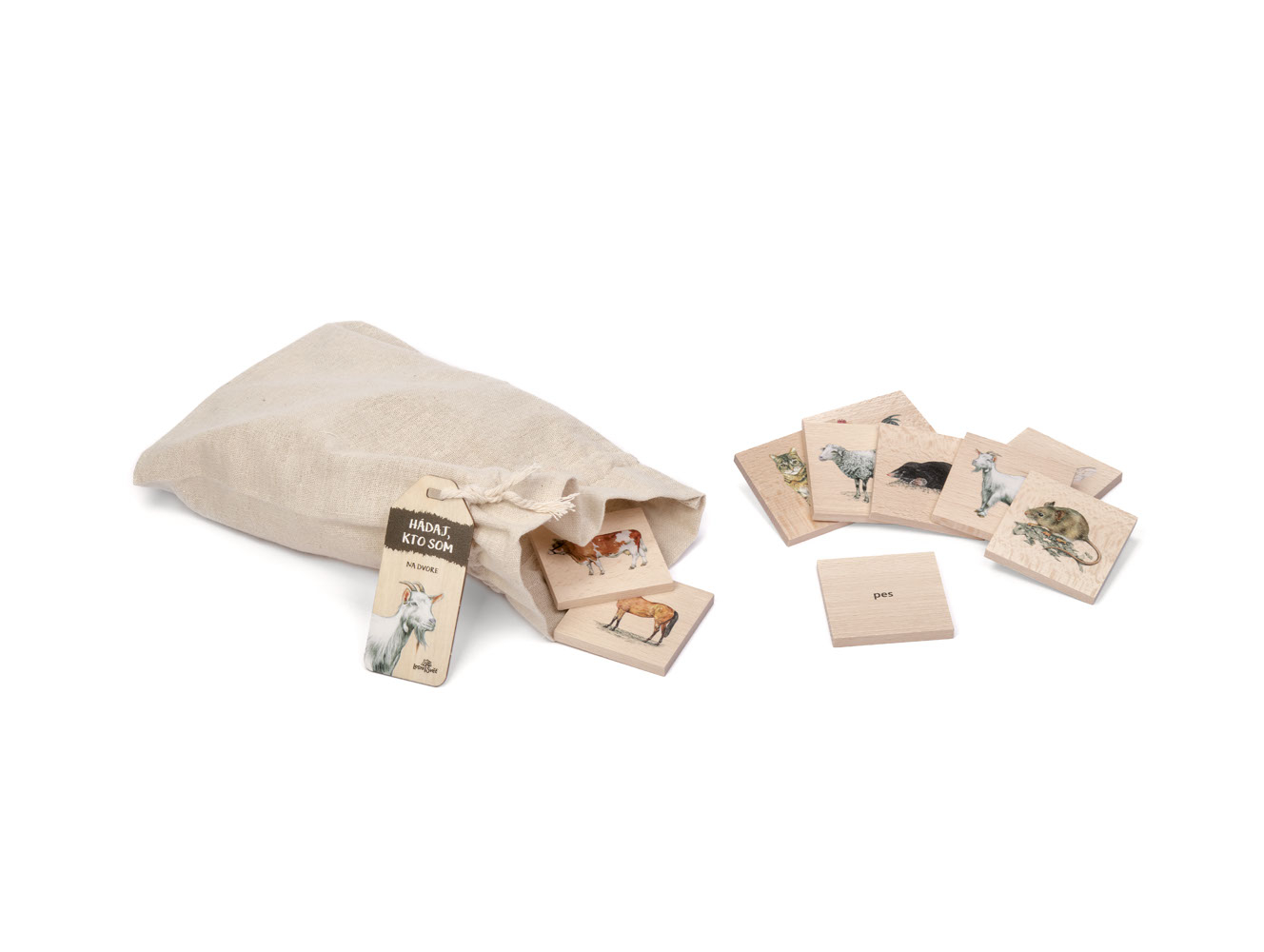 Hádaj, kto som vyrábajú v našej dielni české ruky z kvalitného českého certifikovaného dreva. Balenie obsahuje 24 kociek s rozmermi 7 cm × 7 cm z masívu. Zabalené v prírodnom látkovom vrecúšku. Autori kresieb sú českí ilustrátori, obrázky sú chránené autorskými právami. Hádaj, kto som zábavnou a hravou formou zoznamuje deti aj dospelých s prírodou. Deti podľa reálnej ilustrácie na kocke spoznávajú domáce zvieratko. Správnu odpoveď si overia po otočení kocky, kde nájdu názov zvieratka. Lesný svet = značka s ekologickým certifikátom udržateľného hospodárstva PEFC. Všetky produkty sú vyrobené s ohľadom na životné prostredie.
