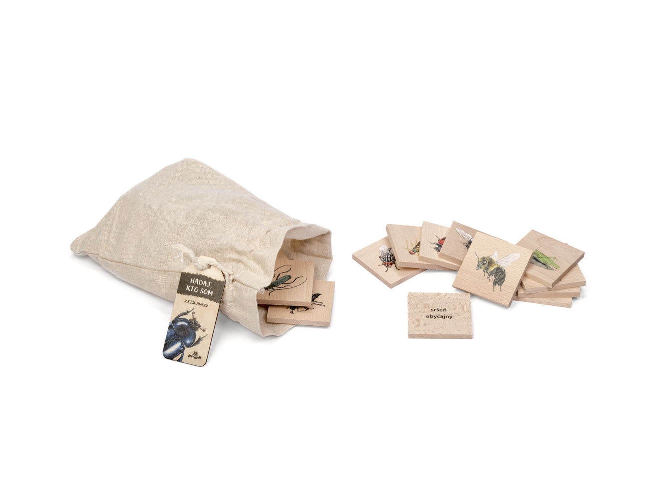 Hádaj, kto som vyrábajú v našej dielni české ruky z kvalitného českého certifikovaného dreva. Balenie obsahuje 24 kociek s rozmermi 7 cm × 7 cm z masívu. Zabalené v prírodnom látkovom vrecúšku. Autori kresieb sú českí ilustrátori, obrázky sú chránené autorskými právami. Hádaj, kto som zábavnou a hravou formou zoznamuje deti aj dospelých s prírodou. Deti podľa reálnej ilustrácie na kocke spoznávajú hmyz. Správnu odpoveď si overia po otočení kocky, kde nájdu názov hmyzu. Lesný svet = značka s ekologickým certifikátom udržateľného hospodárstva PEFC. Všetky produkty sú vyrobené s ohľadom na životné prostredie.