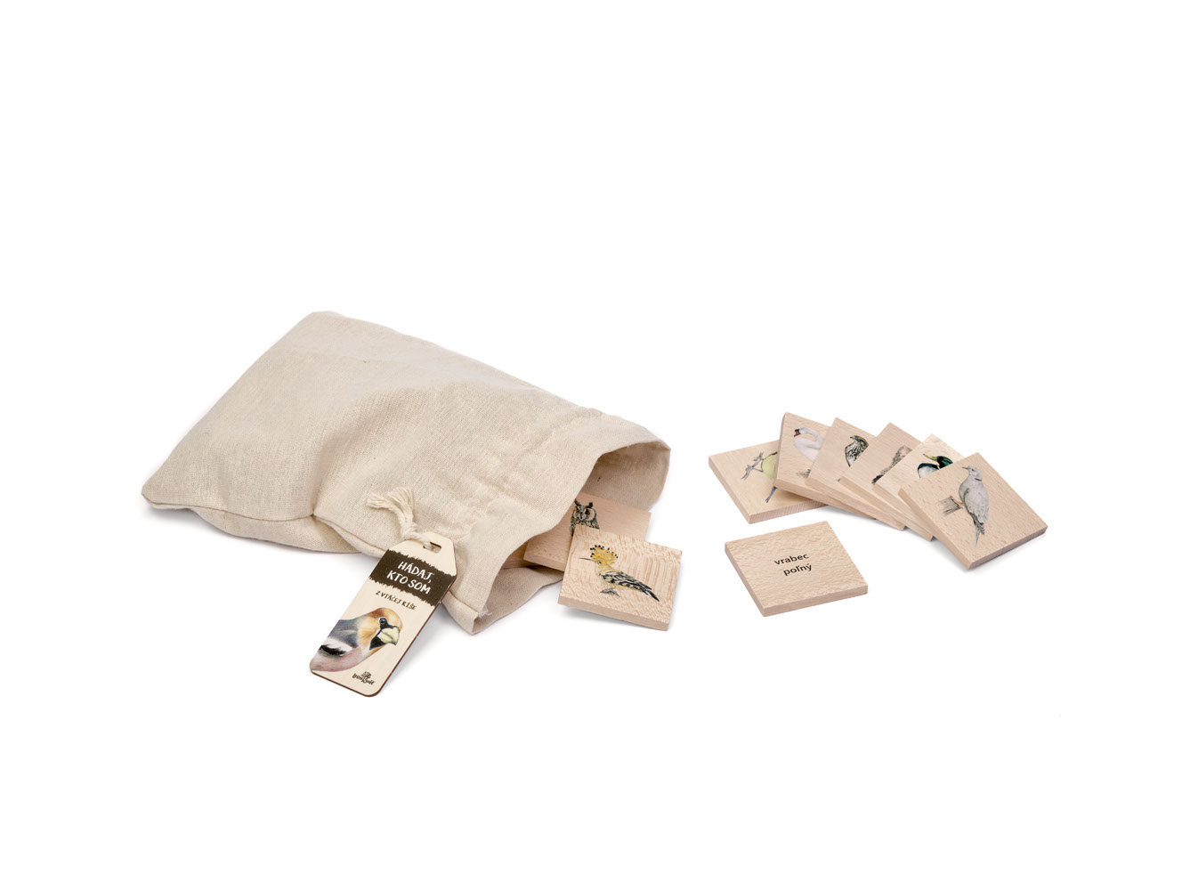 Hádaj, kto som vyrábajú v našej dielni české ruky z kvalitného českého certifikovaného dreva. Balenie obsahuje 24 kociek s rozmermi 7 cm × 7 cm z masívu. Zabalené v prírodnom látkovom vrecúšku. Autori kresieb sú českí ilustrátori, obrázky sú chránené autorskými právami. Hádaj, kto som zábavnou a hravou formou zoznamuje deti aj dospelých s prírodou. Deti podľa reálnej ilustrácie na kocke spoznávajú vtáka. Správnu odpoveď si overia po otočení kocky, kde nájdu názov vtáka. Lesný svet = značka s ekologickým certifikátom udržateľného hospodárstva PEFC. Všetky produkty sú vyrobené s ohľadom na životné prostredie.