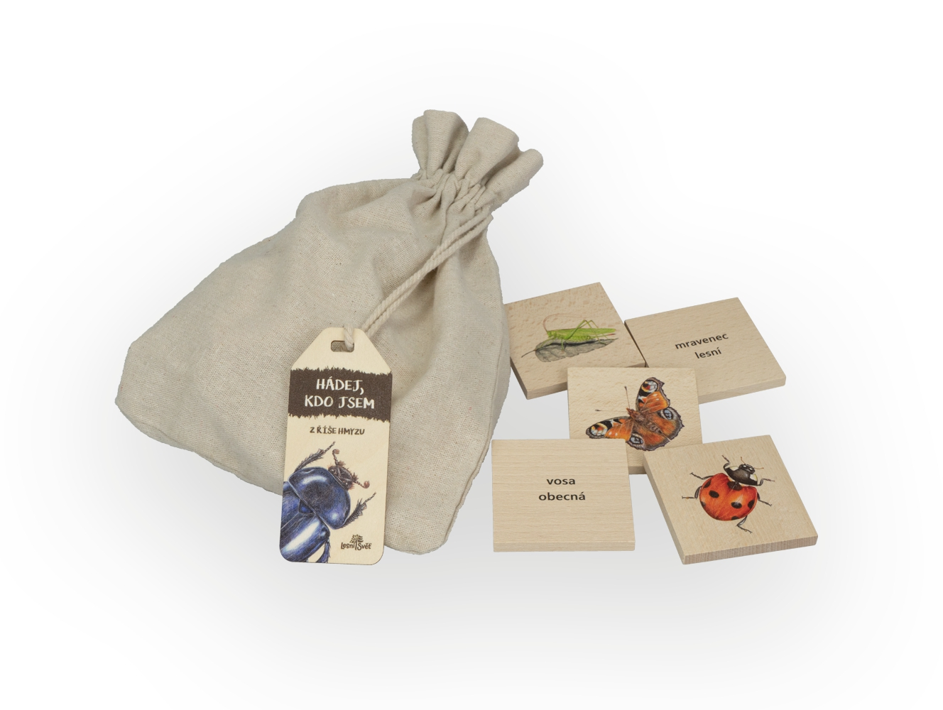• „Hádej, kdo jsem“ vyrábí u nás v dílně české ruce z kvalitního českého certifikovaného dřeva. • Balení obsahuje 24 kostiček v rozměru 7 × 7 × 0,7 cm z masivu. • Zabaleno v přírodním látkovém pytlíku. • Autorem kreseb jsou čeští ilustrátoři, obrázky jsou chráněny autorskými právy. • „Hádej, kdo jsem“ zábavnou a hravou formou seznamuje děti i dospělé s přírodou. • Děti podle reálné ilustrace na kostičce poznávají hmyz. Správnou odpověď si ověří po otočení kostičky, kde je natištěný název hmyzu. • Druhy: světluška větší, klíště obecné, vážka ploská, blecha obecná, kobylka zelená, mravenec lesní, sršeň obecná, chroust obecný, komár pisklavý, otakárek fenyklový, babočka paví oko, křižák obecný, včela medonosná, čmelák zemní, moucha domácí, ruměnice pospolná, zlatohlávek zlatý, chrobák jarní, nosorožík kapucínek, roháč obecný, tesařík pižmový, slunéčko sedmitečné, škvor obecný, vosa obecná. • Lesní svět = značka s ekologickým certifikátem udržitelného hospodářství PEFC. Všechny výrobky jsou vyrobeny s ohledem na životní prostředí.