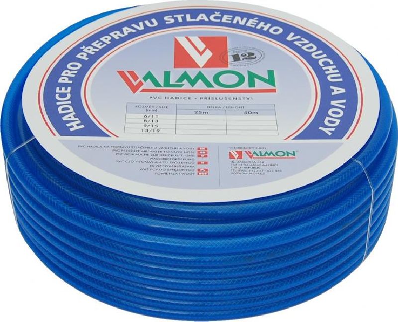 Speciální třívrstvá hadice pro přepravu vzduchu a vody při teplotách do 60°C v náročných průmyslových podmínkách. Speciální receptura zajišťuje vysokou životnost a odolnost vůči povětrnostním podmínkám.Vnitřní průměr:8 mmVnější průměr:13 mmDélka návinu:50 mDuše hadice:PVC tmavě modré - průhlednéOpletení (tlaková kostra):dvouvrstvé vysoce pevnostní polyesterovou přízíPlášť hadice:PVC tmavě modré - průhlednéPracovní teplota:-5°C až + 60°CPracovní tlak:20 bar (2,0 MPa)Poruchový tlak:50 bar (5,0 MPa)