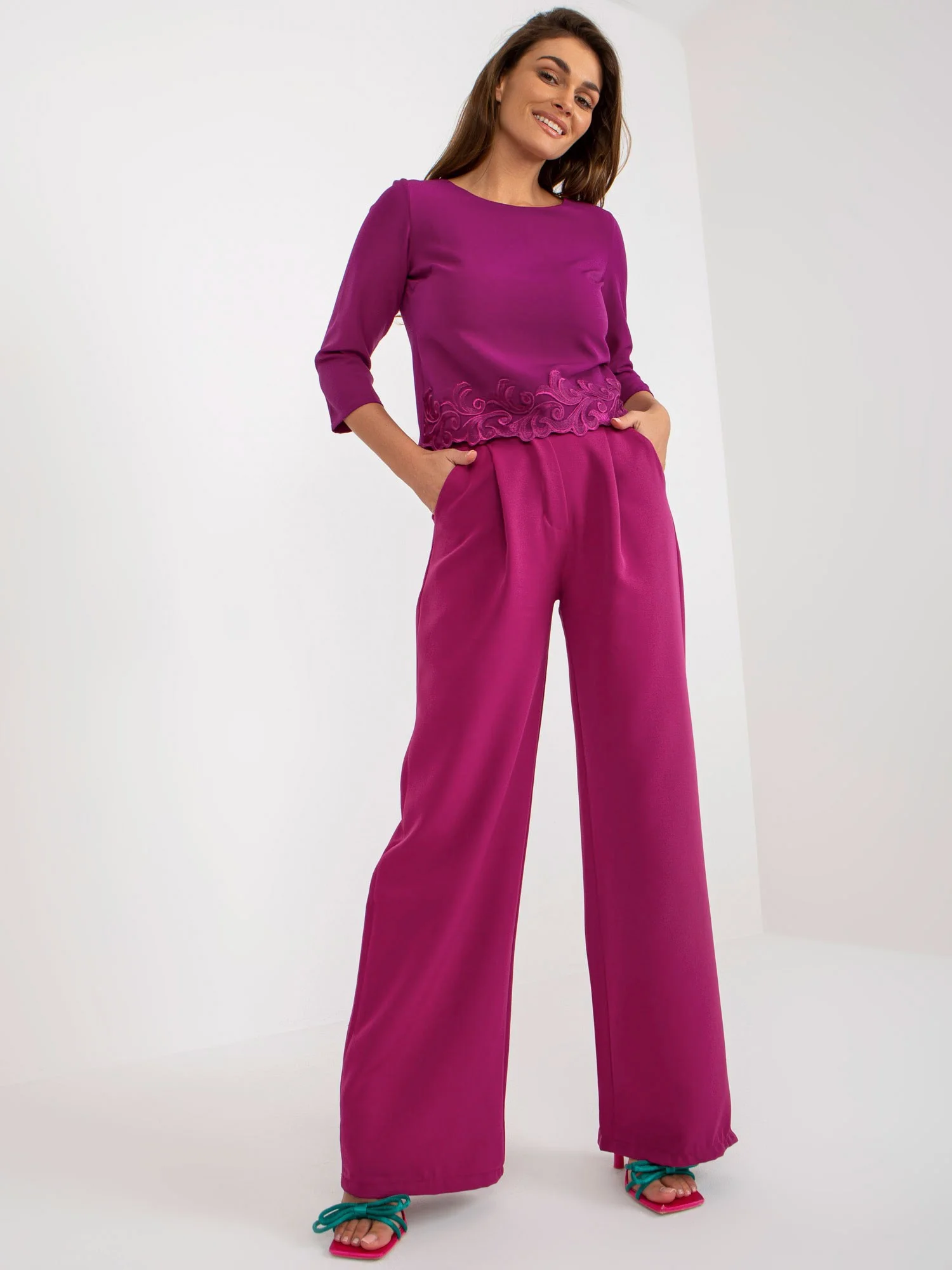 Fialová krátká společenská halenka s 3/4 rukávy. kód produktu: LK-BZ-505970.33P dominantní vzor: hladký styl: elegantní příležitost: večer, rande Modelka má na sobě velikost 36. Rozměry modelky: výška 170 cm, poprsí 93 cm, pas 66 cm, boky 93 cm. Rozměry svetru ve velikosti 36 měřené na plocho: šířka v podpaží - 43 cm, délka rukávu - 40 cm, celková délka - 45 cm.Velikost Alt.VýškaObvod hrudníku hrudníkExterní. délka. rukávVnitřní. délka rukávu36S160-16882594938M162-17286615140L164-17491635342XL166-178966555