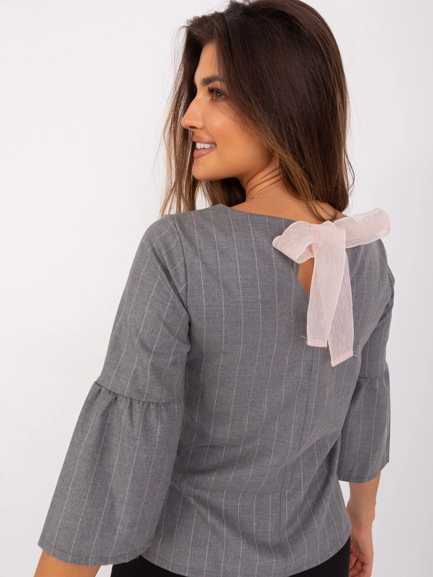 Šedá a světle růžová pruhovaná společenská halenka . Kód produktu: LK-BZ-506434.33P dominantní vzor: pruhy styl: elegantní příležitost: neformální, pracovní, venkovní Modelka má na sobě velikost 36. Rozměry modelky: výška 173 cm, prsa 89 cm, pas 65 cm, boky 91 cm. Rozměry halenky ve velikosti 36 měřené na plocho: šířka v podpaží - 45 cm, celková délka - 54 cm, délka rukávu - 42 cmVelikost Alt.VýškaObvod hrudníku hrudníkExterní. délka. rukávVnitřní. délka rukávu36S160-16882594938M162-17286615140L164-17491635342XL166-178966555