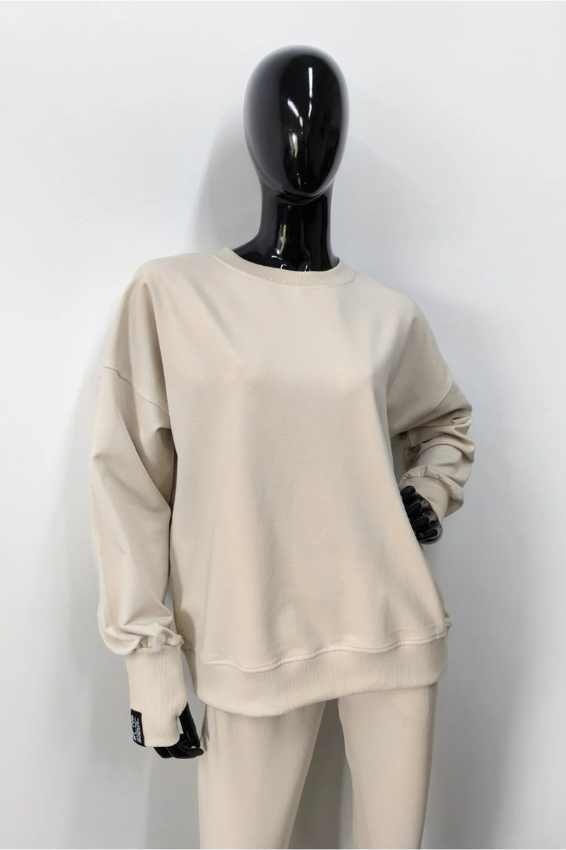 Szukasz wygodnej, a zarazem stylowej bluzy na co dzień? Ten model to idealna odpowiedź na potrzeby kobiet ceniących uniwersalność i nowoczesny styl. Bluza została wykonana z wysokiej jakości elastycznej dzianiny bawełnianej (95% bawełna, 5% elastan), dzięki czemu jest niezwykle przyjemna w dotyku, oddychająca i trwała. Klasyczny, jednokolorowy design w połączeniu z krojem oversize i obniżoną linią ramion nadaje jej swobodnego, casualowego charakteru. Elastyczne ściągacze przy dekolcie, rękawach i u dołu bluzy nie tylko poprawiają komfort noszenia, ale też nadają sportowy wygląd. Dodatkowym atutem są otwory na kciuki – praktyczny i modny detal, który sprawdzi się w chłodniejsze dni. Na jednym z rękawów znajduje się stylowa, czarna naszywka, która podkreśla minimalistyczny styl bluzy. Świetnie komponuje się z jeansami, legginsami lub spodniami dresowymi – i