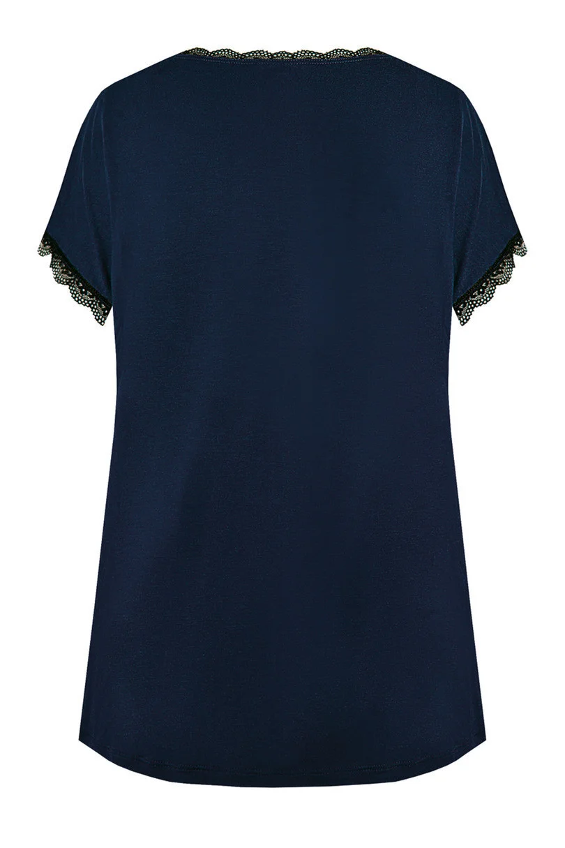 Dámská viskózová halenka s jemnými krajkovými lemovanými rukávy, kulatý výstřih. Složení: 70% viskóza, 14% polyamid, 8% elastan, 8% ostatní .