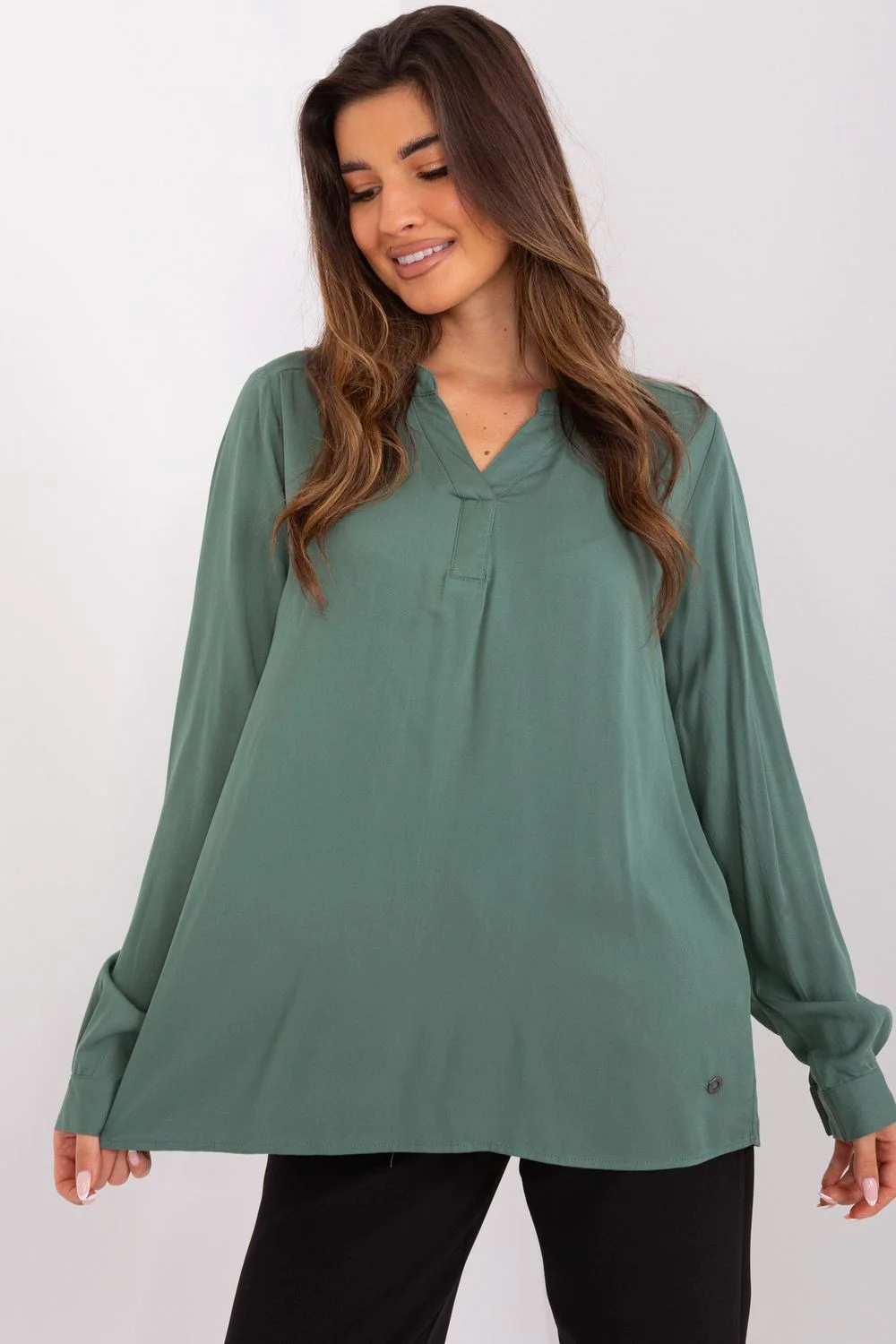 Tato halenka je klasikou ve světě ležérního stylu, ideální pro každodenní nošení. Je vyrobena z hladkého materiálu, takže se pohodlně a lehce nosí. Díky dlouhému rukávu je skvělou volbou pro chladnější dny. Halenka má univerzální výstřih do V, který dodává jemnost a zvýrazňuje ženskou siluetu. Případně výstřih do V dodává halence jemnost a eleganci. Převažujícím materiálem je kvalitní viskóza, což znamená, že halenka je měkká na dotek, prodyšná a příjemná na pokožce. Je ideální volbou pro různé příležitosti, ať už do práce, nebo na setkání s přáteli. Je složena jako celek v duchu ležérního stylu a tvoří klíčový kousek šatníku, který lze snadno kombinovat s různými spodními díly a vytvářet tak různé looky. Viskóza 100 % Velikost Obvod prsou L91 cmM86 cmS82 cmXL96 cmXXL100 cm
