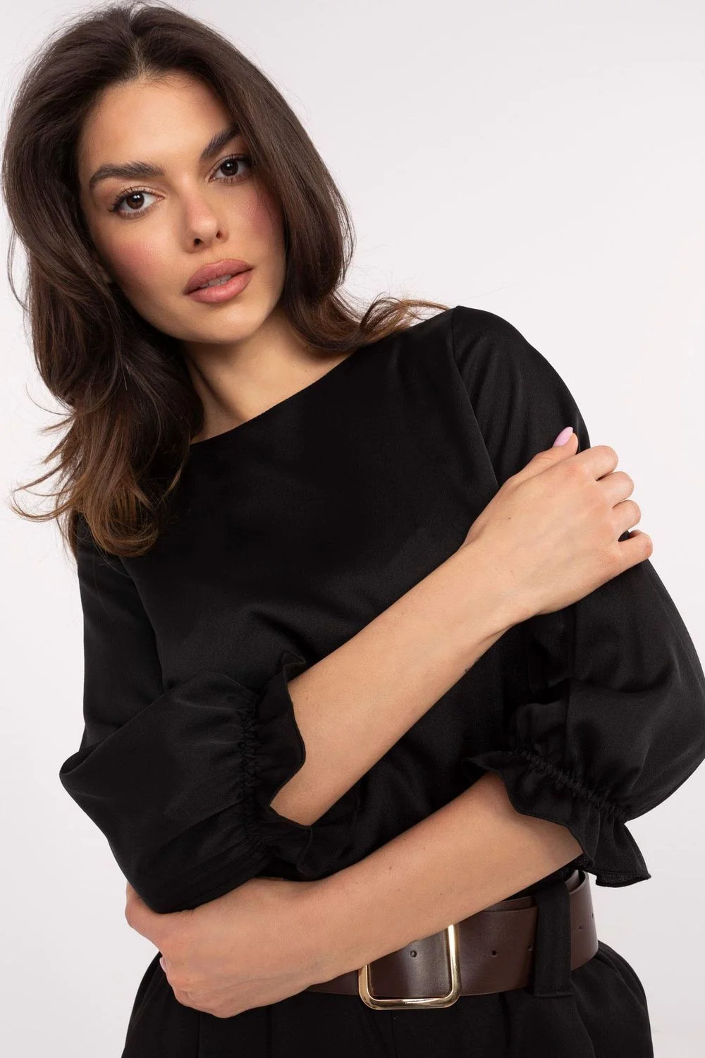 Elegantní blůzka klasického střihu, ideální na každý den, do práce nebo na formální události. Vyrobená z směsi viskózy a polyesteru, poskytuje pohodlí, prodyšnost a odolnost. Hladký vzor jí dodává minimalistický a zároveň stylový charakter. Model má standardní délku a 3/4 rukávy, které byly ozdobeny jemnými volánky, dodávajícími celkovému vzhledu jemný ženský akcent. Kulatý výstřih zdůrazňuje elegantní jednoduchost střihu. Blůzka skvěle ladí jak s elegantními kalhotami, tak s sukněmi, vytvářející stylové a univerzální outfit. Polyester 50 % Viskóza 50 % Velikost Vnitřní délka rukávu Vnější délka rukávu Obvod prsou 3649 cm59 cm82 cm3851 cm61 cm86 cm4053 cm63 cm91 cm4255 cm65 cm96 cm