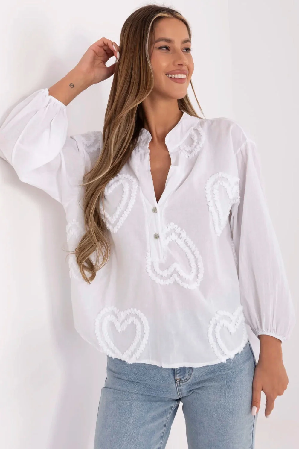 Elegantní a ženská blůza ve stylu boho je skvělou volbou na každý den, do práce nebo i na více formální události. Vyrobená z bavlněného materiálu s různými texturami, okouzlí jemným zpracováním a péčí o detaily. Standardní délka, dlouhý nafouklý rukáv se zakončením na gumu a stojáček s výstřihem do V tvoří velmi harmonický celek. Zavírání na dva knoflíky dodává lehkost a eleganci. Jedná se o univerzální model, který skvěle spojuje pohodlí s trendy a uvolněným boho charakterem. Bavlna 100 % Velikost Vnitřní délka rukávu Vnější délka rukávu Obvod prsou L53 cm63 cm91 cmM51 cm61 cm86 cmS49 cm59 cm82 cmXL55 cm65 cm96 cm