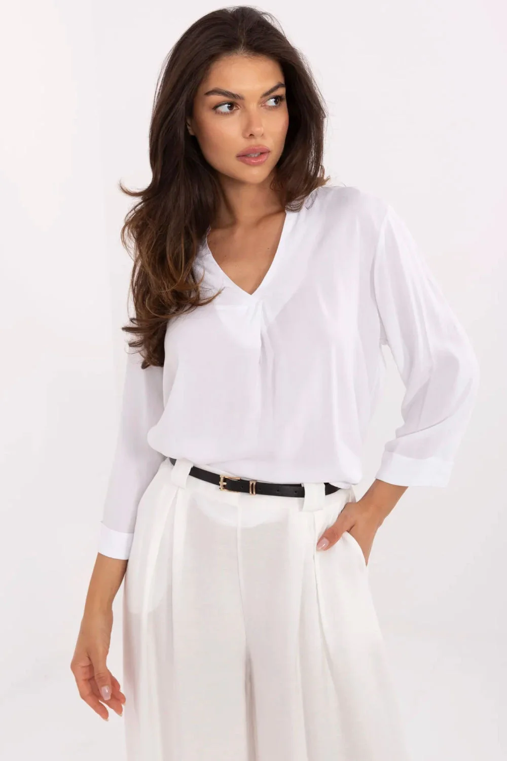 Každodenní volnější košile je ideální nabídkou jak pro běžné nošení, tak i do práce. Ušitá z příjemného, ekologického viskózu, kombinuje pohodlí nošení s ohledem na životní prostředí. Model s hladkým zpracováním, s výstřihem do V a s 3/4 rukávem, vypadá elegantně a žensky. Jemným ozdobným prvkem je jemný záhyb vpředu, který dodává celku jemný půvab a lehkost. Standardní délka a absence zapínání zajišťuje, že košile je pohodlná a snadno se obléká. Jedná se o univerzální a stylovou nabídku, která se hodí do mnoha každodenních stylizací. Viskóza 100 % Velikost Obvod prsou L91 cmM86 cmS82 cmXL96 cmXXL100 cm