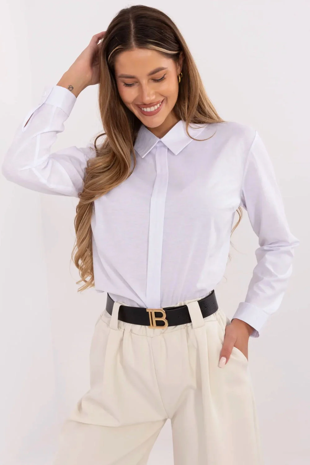 Elegantní košilová blůza s klasickým střihem je ideální volbou na různé příležitosti, hodí se jak jako součást elegantního outfitu, tak i jako každodenní pracovní oděv. Vyrobená z převažující bavlny poskytuje pohodlí a prodyšnost po celý den. Hladký materiál zdůrazňuje minimalistický, nadčasový charakter blůzy a ozdobný proužek na přední straně jí dodává jemný šarm a eleganci. Model s standardní délkou, dlouhým rukávem a klasickým límečkem skvěle ladí s saka, kalhotami s lemem nebo olověnou sukní. Jedná se o univerzální kus oblečení, který by neměl chybět v žádné ženské šatně. Bavlna 100 % Velikost Obvod prsou L90 cmM86 cmS82 cmXL96 cm
