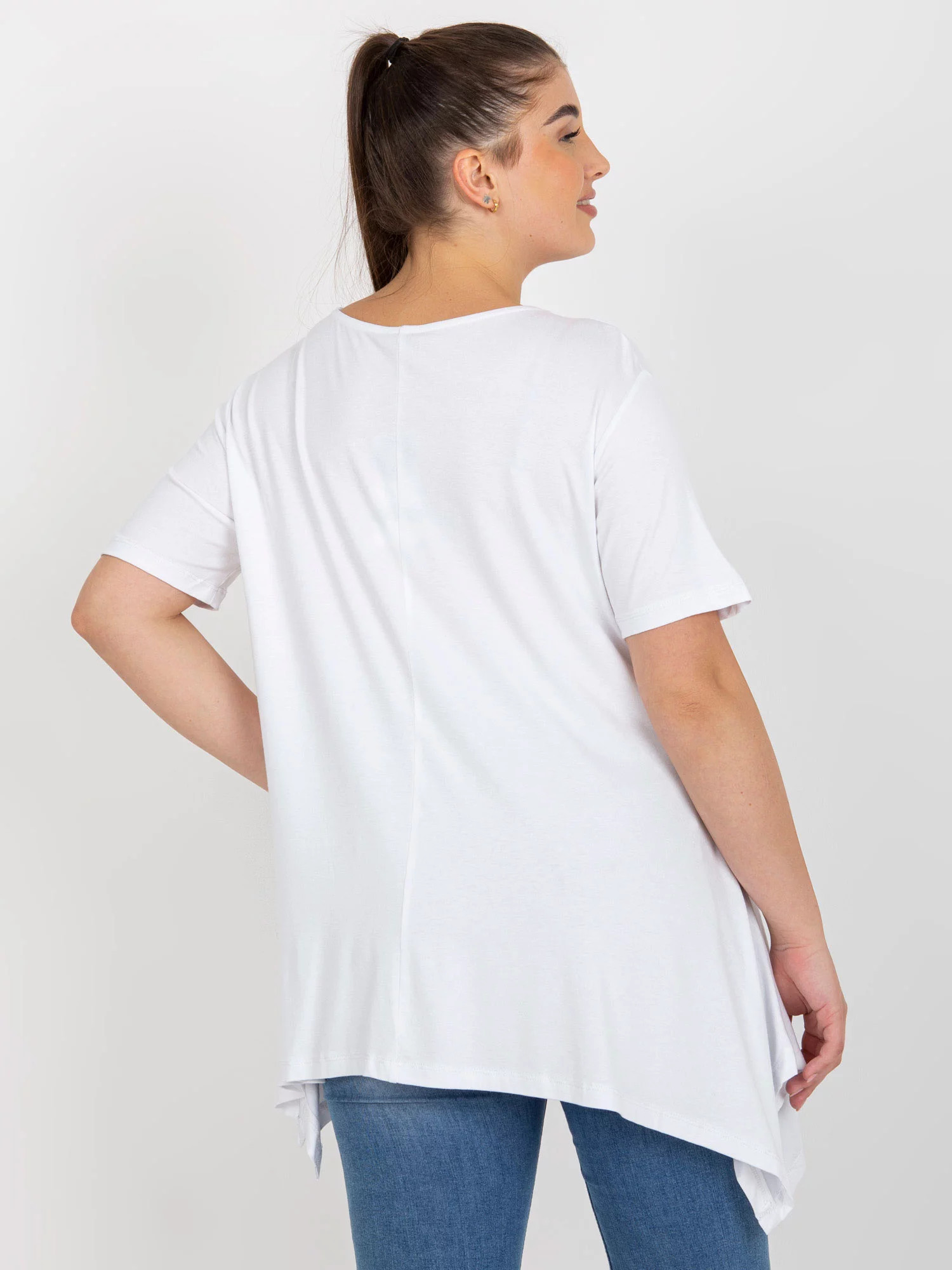 Bílá hladká plus size halenka s kulatým výstřihem . Kód produktu: RV-BZ-7857.58 dominantní vzor: hladký styl: ležérní příležitost: neformální, procházky, město, práce Modelka má na sobě jednu velikost. Rozměry modelky: výška 174 cm, prsa 100 cm, pas 74 cm, boky 107 cm. Rozměry halenky v jedné velikosti měřené na plocho: šířka v podpaží - 55 cm, celková délka - 82 cm.