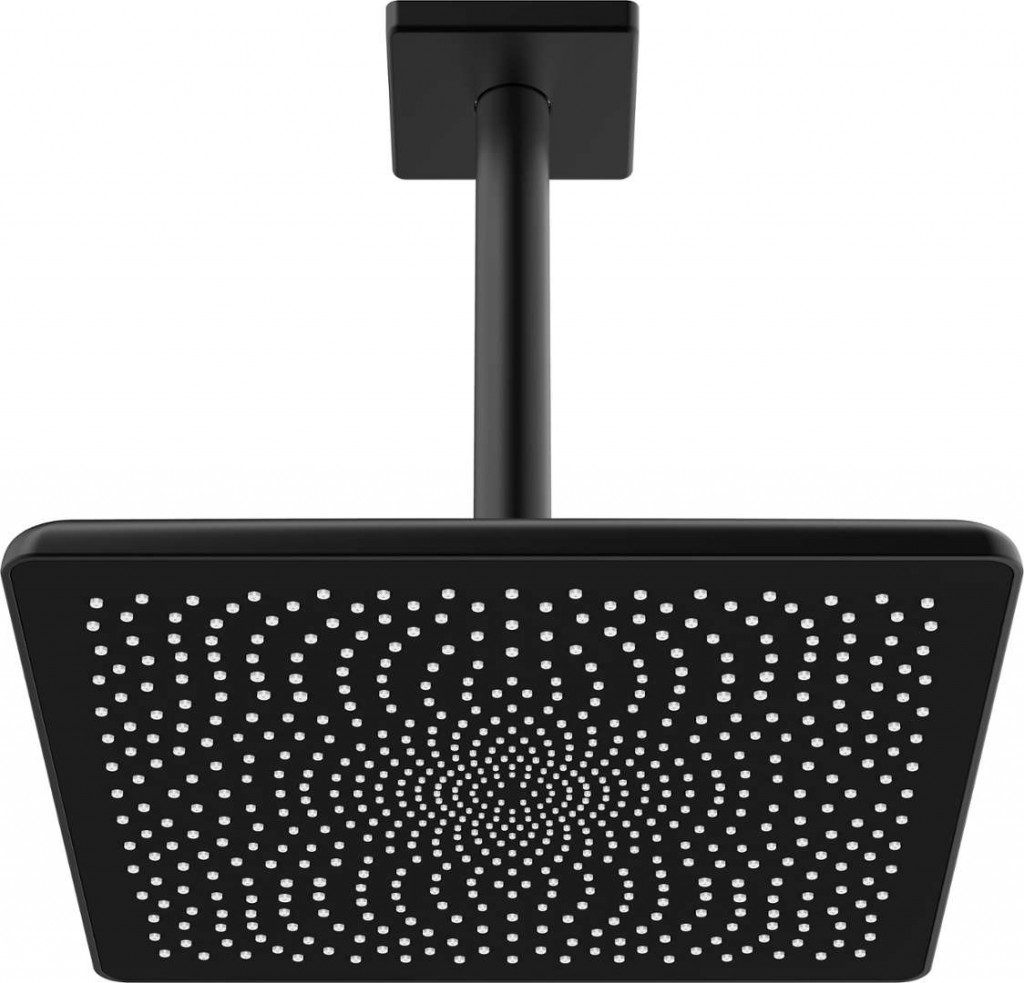 Horní sprcha s ramenem barva matná černá materiál mosaz/plast hranatý tvar rozměr 250 x 250 mm průtok 12 l/min (při tlaku 3 bar) 1 proud kulový kloub snadné a rychlé čištění vápenatých usazenin včetně stropního sprchového ramene připojení G 1/2"