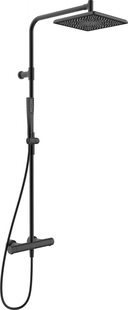 Sprchový set obsahuje: Nástěnnou termostatickou baterii barva matná černá materiál mosaz/plast termostatická kartuše bezpečnostní zarážka na 38 °C kohoutkové ovládání nástěnná montáž rozteč 150±15 mm Eco funkce k omezení průtoku vody THERMO COOL technologie zabraňující opaření snadné a rychlé čištění vápenatých usazenin Hlavovou sprchu barva matná černá 1 proud otočná hranatý tvar rozměr 250 x 250 mm snadné a rychlé čištění vápenatých usazenin Ruční sprchu barva matná černá 1 proud - rovnoměrný a jemný proud vody snadné a rychlé čištění vápenatých usazenin Sprchovou hadici délka 1750 mm připojení G 1/2" Sprchovou tyč s držákem ruční sprchy