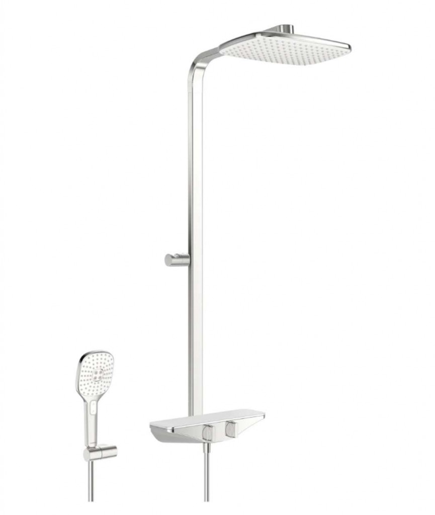 Nástěnný sprchový set obsahuje, hlavovou sprchu, ruční sprchu s hadicí, sprchovou tyč a držák sprchovou termostatickou baterii barevné provedení bílé sklo materiál mosaz bezpečnostní pojistka při 38 °C prostorná odkládací plocha z bezpečnostního skla kulové připojovací etážky, zakryté otočný přepínač, přepínač integrovaný do ovládače průtoku rukojeť regulátoru teploty, rukojeť regulátoru průtoku průtok při 3 barech 13.8 l/min rozteč: 150 ± 15 mm výstup dolů G 1/2 síťka proti nečistotám a zpětné klapky v připojeních zabezpečeno proti zpětnému toku při použití v domácnosti (dle DIN EN 1717) Thermo Cool - oddělené vedení vody od tělesa termostatu způsobuje, že se povrch termostatu nezahřívá (ochrana proti opaření) hlavovou pevnou sprchu obdélníkový tvar rozměr 360x220 mm ruční sprchu HANSAACTIVEJET Style a sprchovou hadici o délce 1750 mm 3 druhy proudu Sensitive Spray - měkký, uvolňující proud Intense Spray - na denní použití, ideální na mytí dlouhých vlasů Rain - objemný, velkorysý vodní proud
