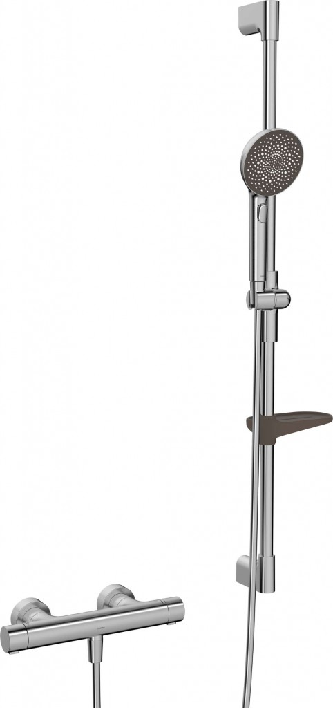 Sprchový set obsahuje: nástěnnou termostatickou baterii barva broušená ocel materiál mosaz/plast termostatická kartuše bezpečnostní zarážka na 38 °C kohoutkové ovládání nástěnná montáž rozteč 150±15 mm Eco funkce k omezení průtoku vody THERMO COOL technologie zabraňující opaření snadné a rychlé čištění vápenatých usazenin ruční sprchu barva broušená ocel průměr 110 mm 3 proudy - Pulzující/Intenzivní/Relaxační přepínání tlačítkem snadné a rychlé čištění vápenatých usazenin sprchovou tyč s držákem nastavitelná rozteč úchytů tyč lze zkrátit s nastavitelným držákem ruční sprchy s mýdelníkem sprchovou hadici délka 1750 mm ochrana proti překroucení