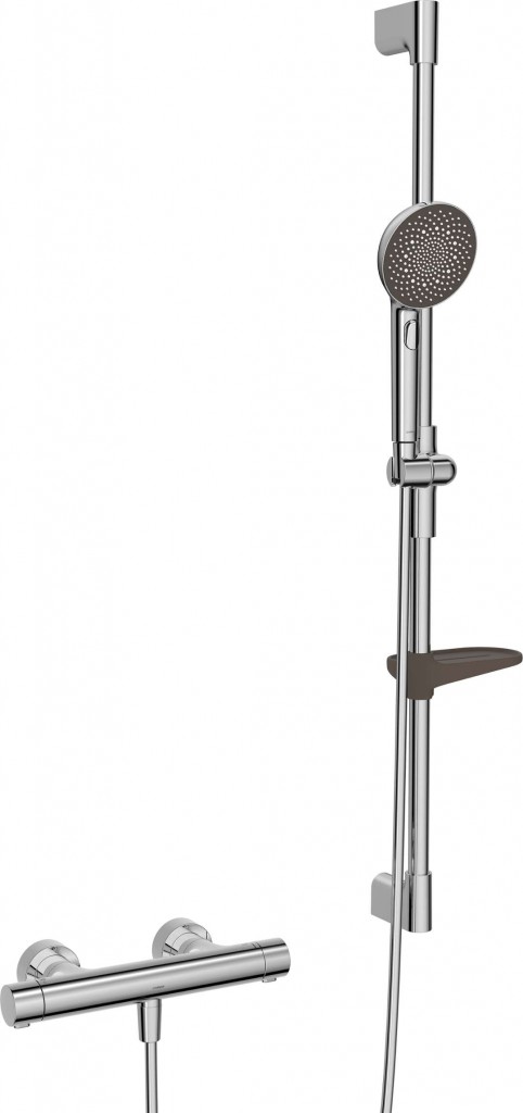 Sprchový set obsahuje: nástěnnou termostatickou baterii barva chrom materiál mosaz/plast termostatická kartuše bezpečnostní zarážka na 38 °C kohoutkové ovládání nástěnná montáž rozteč 150±15 mm Eco funkce k omezení průtoku vody THERMO COOL technologie zabraňující opaření snadné a rychlé čištění vápenatých usazenin ruční sprchu barva chrom průměr 110 mm 3 proudy - Pulzující/Intenzivní/Relaxační přepínání tlačítkem snadné a rychlé čištění vápenatých usazenin sprchovou tyč s držákem nastavitelná rozteč úchytů tyč lze zkrátit s nastavitelným držákem ruční sprchy s mýdelníkem sprchovou hadici délka 1750 mm ochrana proti překroucení