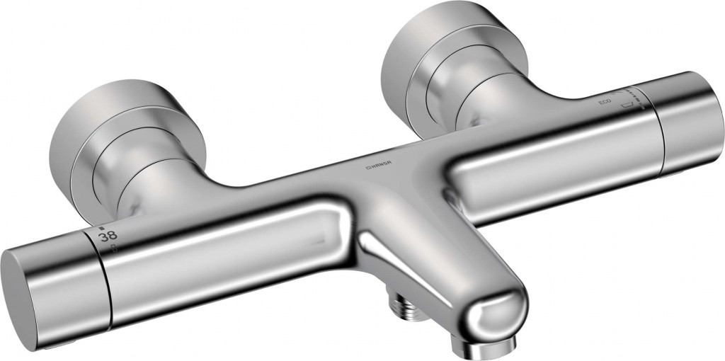 Nástěnná termostatická vanová baterie barva broušená ocel materiál mosaz/plast přepínač vana/sprcha termostatická kartuše bezpečnostní zarážka na 38 °C kohoutkové ovládání nástěnná montáž rozteč 150±15 mm Eco funkce k omezení průtoku vody THERMO COOL technologie zabraňující opaření kruhové rozety, průměr 60 mm délka výtoku 180 mm připojení sprchy G1/2" perlátor integrované zpětné klapky zachytávač nečistot bez příslušenství