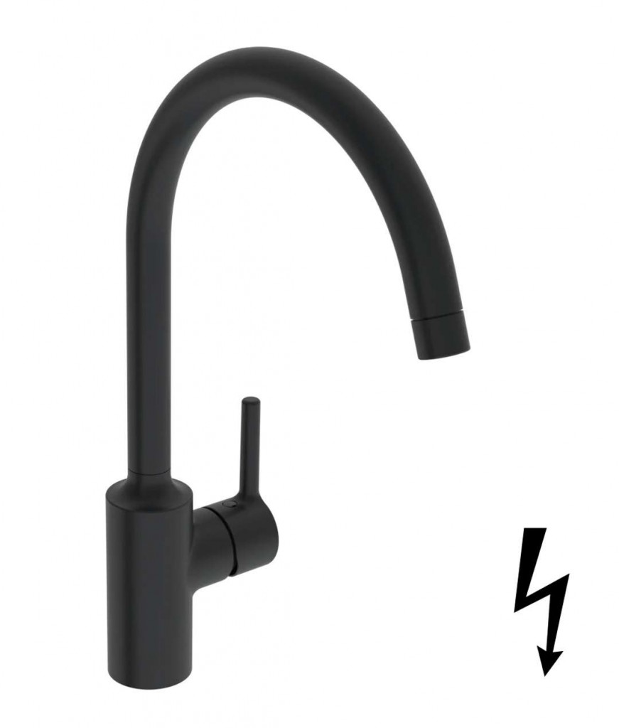 Kuchyňská stojánková baterie pro beztlakové ohřívače barva matná černá materiál mosaz výška baterie 361 mm délka výtoku 213 mm komfortní zóna 250 mm otočné výtokové rameno CASCADE aerátor s laminárním proudem stojánková jednootvorová montáž pákové ovládání keramická kartuše 30 mm vhodné pro beztlakové ohřívače vody funkce pro nastavení maximální teploty a průtoku vody flexibilní připojovací hadice připojení G 3/8