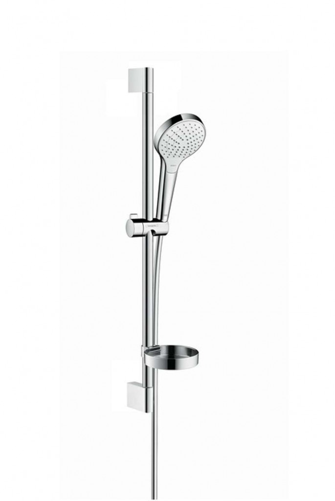 Technické parametry druh proudu: Rain, Turbo Rain, IntenseRain pohodlné přepínání druhů proudu tlačítkem Select velikost sprchové hlavice: 110 mm otočný kloub zabraňuje nepříjemnému kroucení sprchové hadice jezdec s možností nastavení úhlu sklonu o 45° maximální průtok (při 0,3 MPa): 15 l/min chromované držáky na stěnu z umělé hmoty Set obsahuje nástěnnou tyč Unica’Croma 0,65 m (# 26503000) sprchovou hadici Isiflex 1,60 m (# 28276000) misku na mýdlo Casetta’C (# 28678000) ruční sprchu Croma Select S Vario (# 26802400)