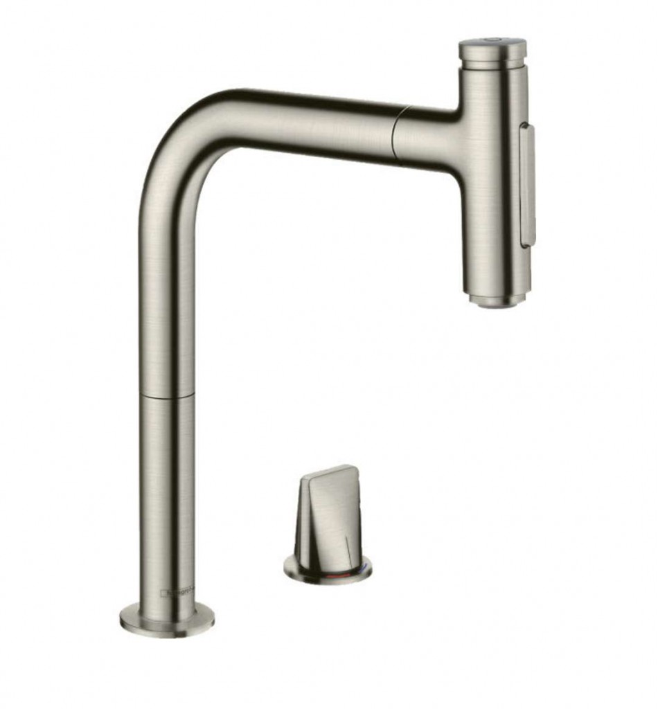 Kuchyňská baterie s pákovým a tlačítkovým ovládáním ComfortZone 200 rozsah otáčení 110° / 150° volitelné umístění ovládací jednotky pro baterii nutné dva otvory o Ø 35 mm laminární a sprchový proud sprchový proud aretovatelný přepínání proudu stiskem tlačítka a automatické zpětné přepnutí proudu při zavření armatury tlačítko Select: pro komfortní zapnutí/vypnutí vody magnetický držák sprchy MagFit rozměr přívodů: DN15 maximální průtok při 0,3 MPa: 8 l/min keramická kartuše způsob montáže: přívodní hadice G 3⁄8 vestavěný zpětný ventil vhodné pro průtokový ohřívač