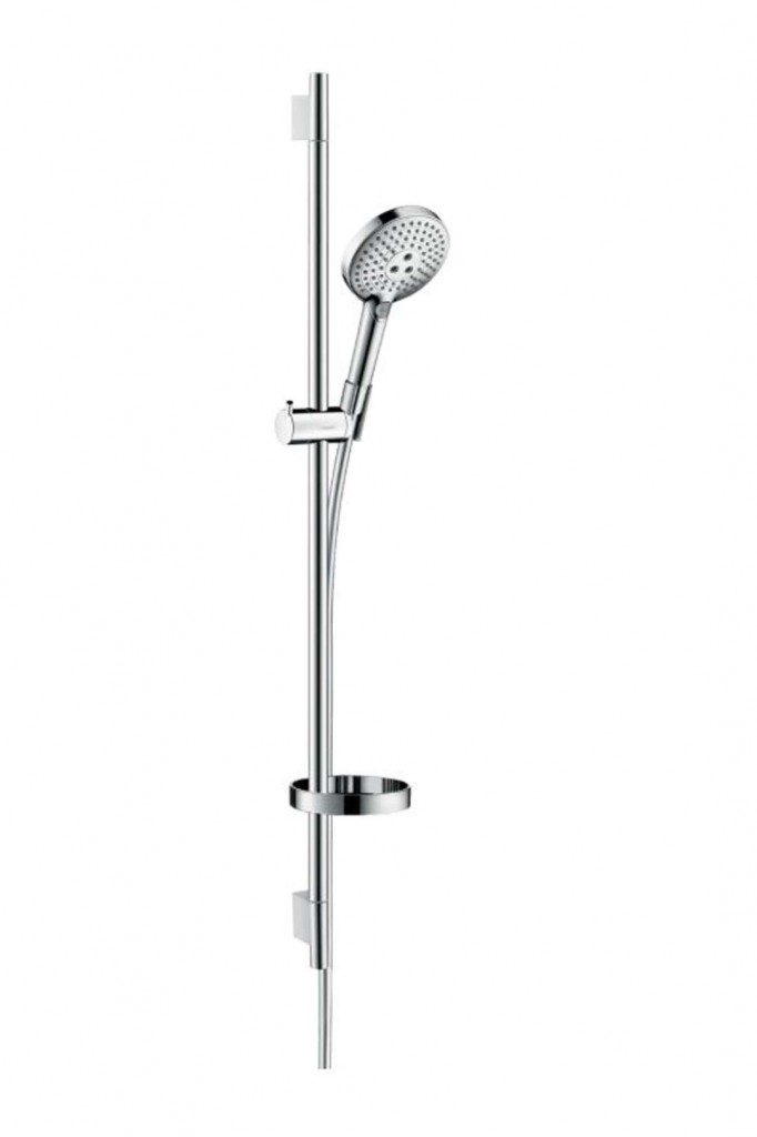 Technické parametry druh proudu: Rain, RainAir, WhirlAir pohodlné přepínání druhů proudu tlačítkem Select velikost sprchové hlavice: 125 mm otočný kloub zabraňuje nepříjemnému kroucení sprchové hadice úhel sklonu měnitelný o 90°, jezdec je vychýlitelný vlevo a vpravo a také nahoru a dolů maximální průtok (při 0,3 MPa): 15 l/min chromované držáky na stěnu z umělé hmoty Set obsahuje ruční sprchu Raindance Select S 120 3jet (# 26530000) nástěnnou tyč Unica’S Puro 0,90 m (# 28631000) sprchovou hadici Isiflex 1,60 m (# 28276000) misku na mýdlo Casetta’S Puro (# 28679000)