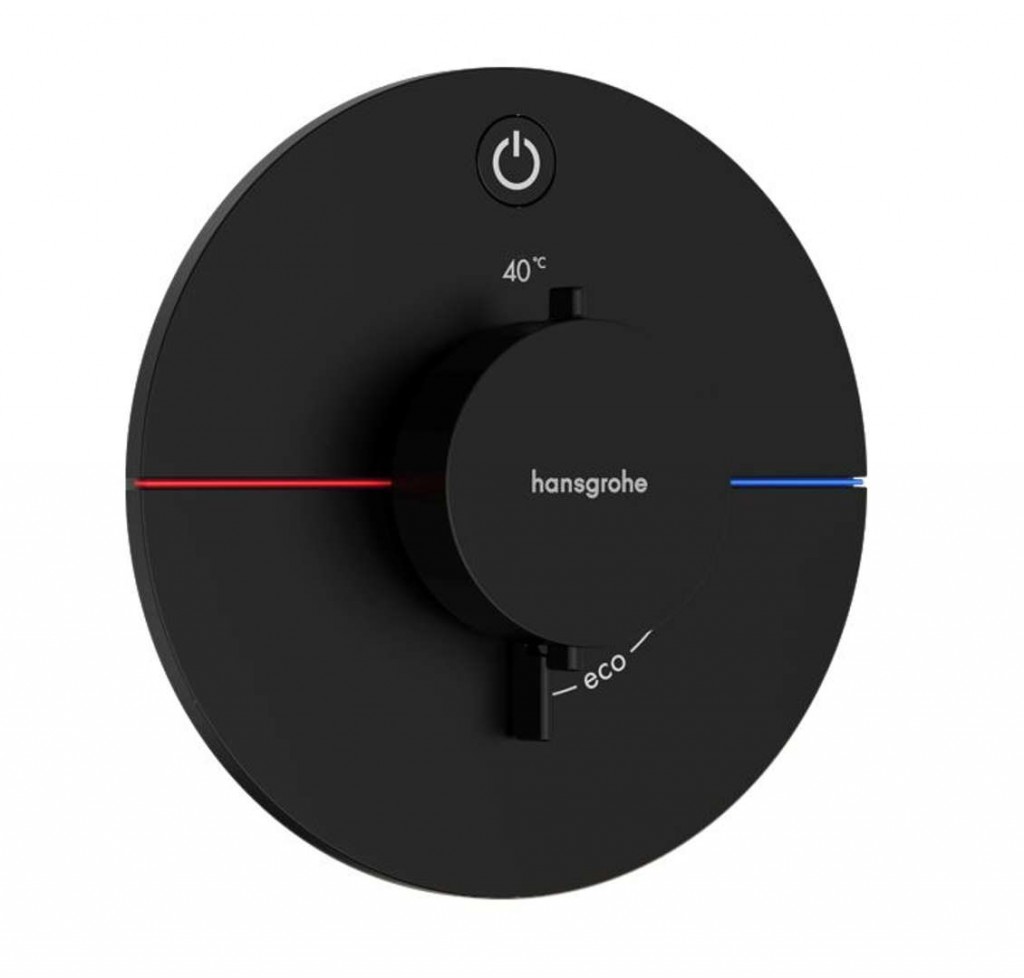 Sprchový termostat pod omítku ShowerSelect Comfort S barva matná černá průměr 155 mm pro 1 spotřebič podomítková montáž na základní těleso zapínání/vypínání pomocí velkého kovového tlačítka Select termostatická kartuše, ventil Select Start/Stop max. průtok 20,3 l/min bezpečnostní pojistka při 40 °C nastavitelné omezení teploty a průtoku možnost termické dezinfekce zpětný ventil dodáváno s tlačítkem zapnout/vypnout Základní podomítkové instalační těleso je nutné zakoupit zvlášť.