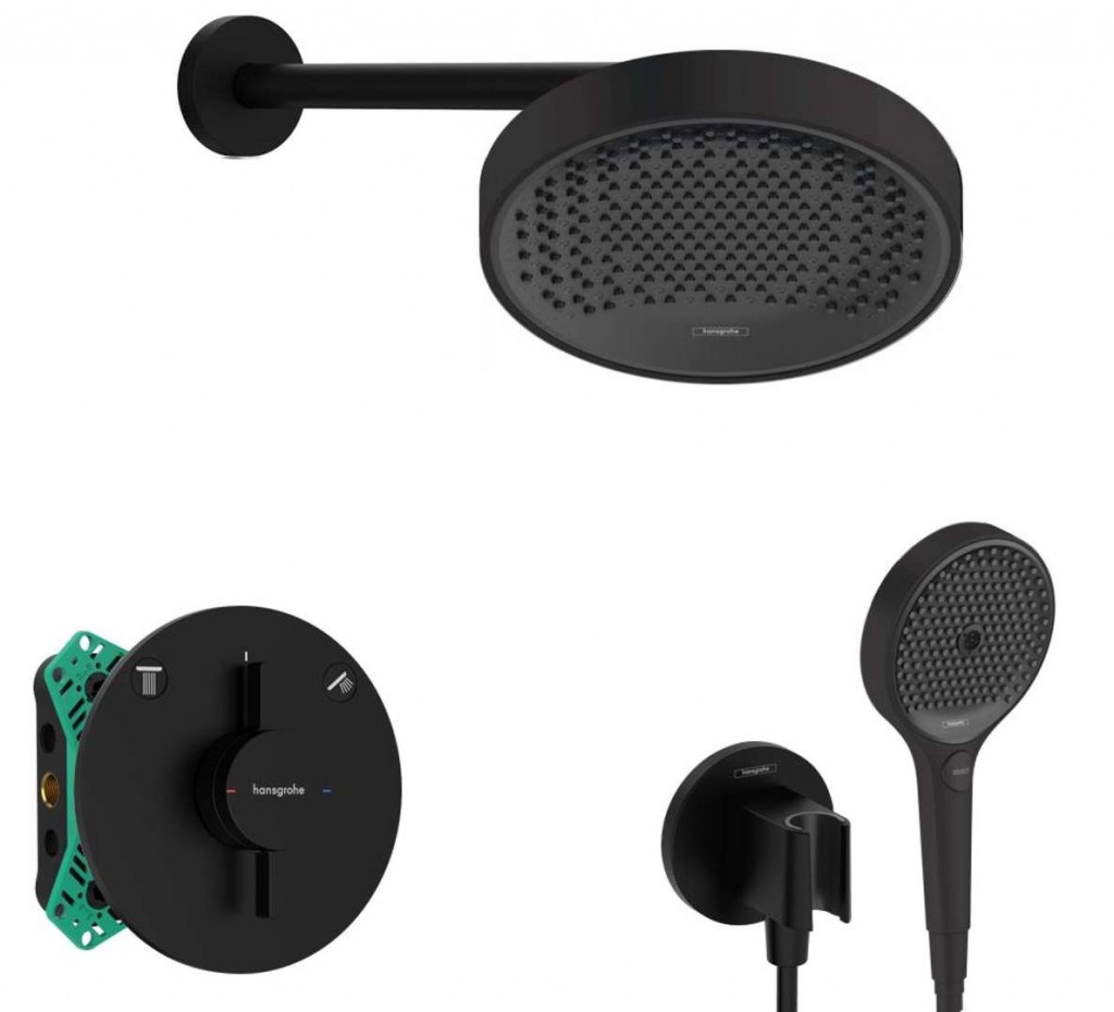 Sprchový set obsahuje: podomítkovou baterii DuoTurn S, s tělesem barva matná černá krycí rozeta Ø 155 mm možnost nastavení rozety v rozsahu +/- 3° kohoutkové ovládání pro 2 spotřebiče dodáváno s tlačítky: Silný déšť/Slabý déšť/Ruční sprcha/Vodopád/Vana maximální průtokové množství: 29,5 l/min (při 3 barech) průtokové množství ruční sprchy: 29,5 l/min (při 3 barech) keramická kartuše Water Flow Control ovládání průtoku vody lze regulovat až o 30 % včetně podomítkového tělesa iBox universal 2 horní sprchu Rainfinity barva matná černá povrchová úprava disku vodních paprsků grafitově černá materiál disku vodních paprsků plast průměr 250 mm XXL Performance druh proudu: PowderRain s technologií QuickClean maximální průtok 16 l/min závit přívodu G 1/2" nástěnné sprchové rameno, délka 393 mm Ruční sprchu Rainfinity barva matná černá průměr 132 mm XXL Performance 3 proudy - PowderRain, IntenseRain, MonoRain pohodlná volba proudu tlačítkem Select maximální průtok 14 l/min s technologií QuickClean závit přívodů G 1/2" Sprchové kolínko s držákem a hadicí barva matná černá materiál plast dvoudílná konstrukce pevná pozice držáku pro hadice s kónickou maticí se zpětným ventilem připojení G 1/2" plastová hadice, délka 160 cm