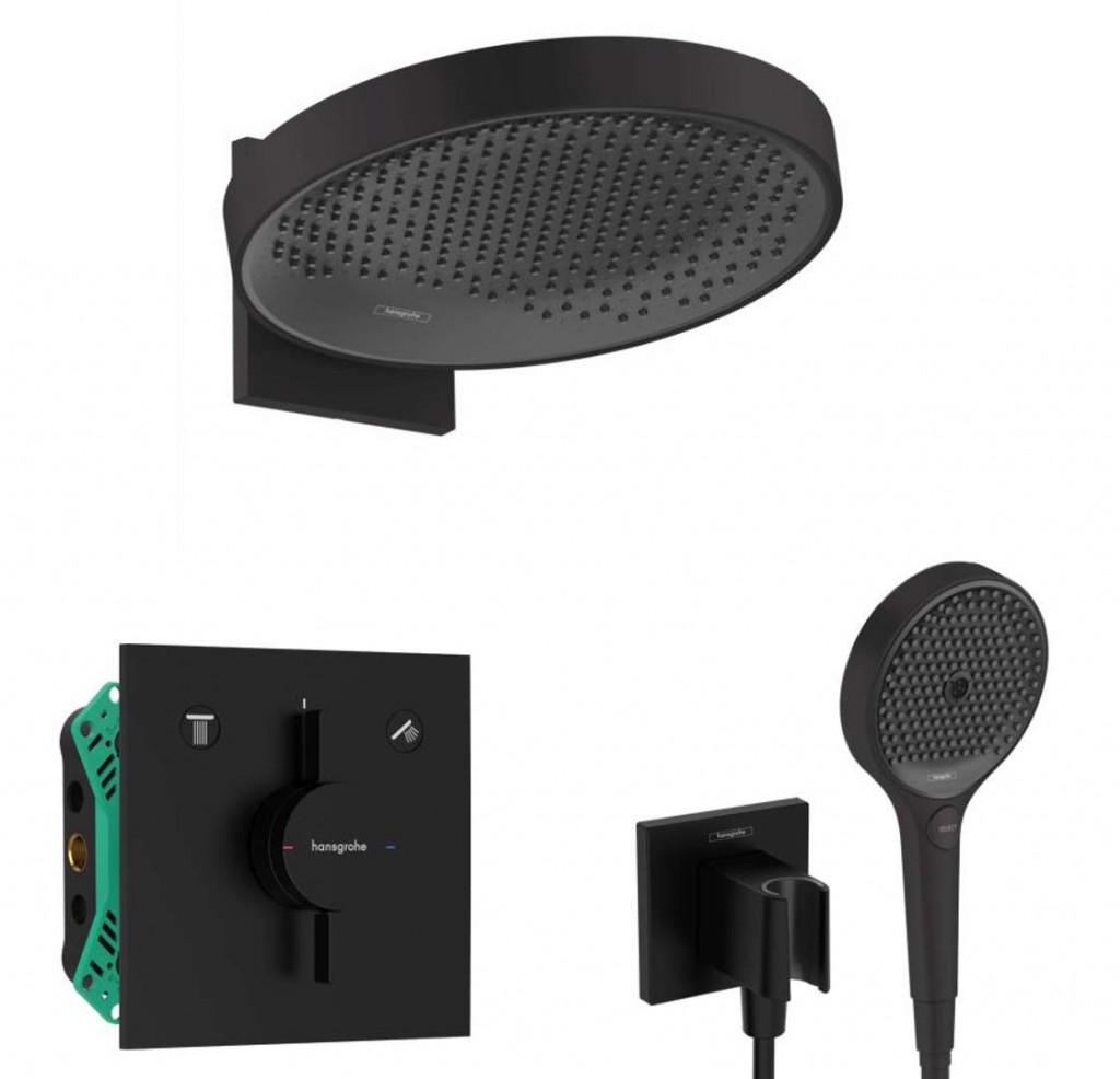 Sprchový set obsahuje: podomítkovou baterii DuoTurn E, s tělesem barva matná černá krycí rozeta 155 x 155 x 7 mm možnost nastavení rozety v rozsahu +/- 3° kohoutkové ovládání pro 2 spotřebiče dodáváno s tlačítky: Silný déšť/Slabý déšť/Ruční sprcha/Vodopád/Vana maximální průtokové množství: 29,5 l/min (při 3 barech) průtokové množství ruční sprchy: 29,5 l/min (při 3 barech) keramická kartuše Water Flow Control ovládání průtoku vody lze regulovat až o 30 % včetně podomítkového tělesa iBox universal 2 horní sprchu Rainfinity s ramenem barva matná černá povrchová úprava disku vodních paprsků grafitově černá materiál disku vodních paprsků hliník průměr 360 mm XXL Performance rameno sprchy vertikálně nastavitelné o 10-30° druh proudu PowderRain s technologií QuickClean maximální průtok 21 l/min závit přívodu G 1/2" nástěnný držák Ruční sprchu Rainfinity barva matná černá průměr 132 mm XXL Performance 3 proudy - PowderRain, IntenseRain, MonoRain pohodlná volba proudu tlačítkem Select maximální průtok 14 l/min s technologií QuickClean závit přívodů G 1/2" Sprchové kolínko s držákem a hadicí barva matná černá materiál plast dvoudílná konstrukce pevná pozice držáku pro hadice s kónickou maticí se zpětným ventilem připojení G 1/2" plastová hadice, délka 160 cm