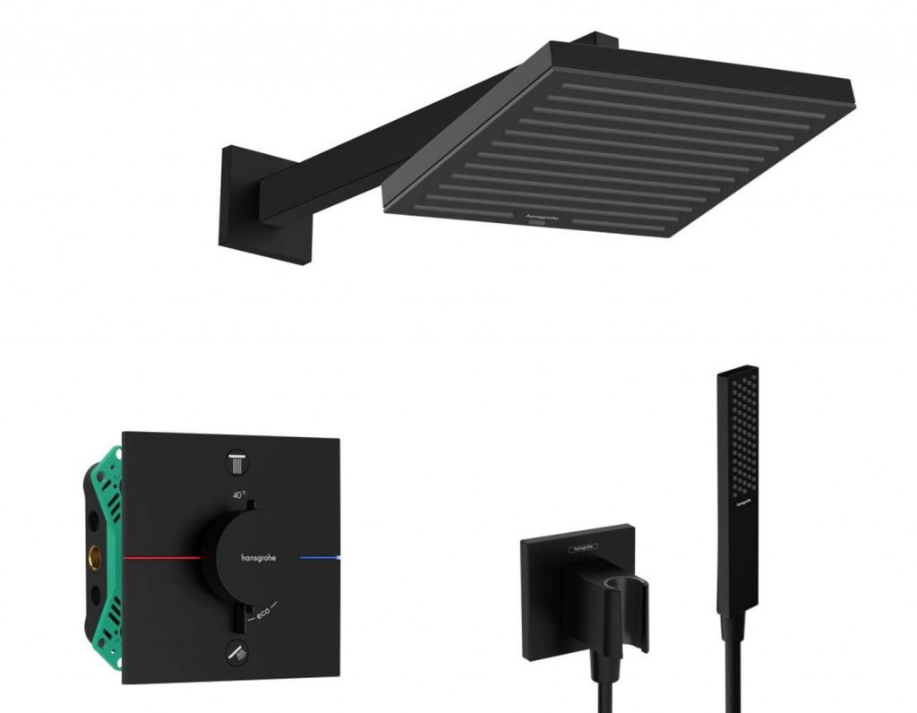 Sprchový set obsahuje: podomítkovou termostatickou baterii ShowerSelect Comfort E, s tělesem barva matná černá rozměr 155 x 155 mm pro 2 spotřebiče současné použití více spotřebičů podomítková montáž na základní těleso zapínání/vypínání pomocí velkého kovového tlačítka Select termostatická kartuše, ventil Select Start/Stop max. průtok 22,1 l/min bezpečnostní pojistka při 40 °C nastavitelné omezení teploty a průtoku možnost termické dezinfekce zpětný ventil dodáváno s tlačítkem Rain malý, Rain velký, ruční sprchu, vodopád, vanu včetně podomítkového tělesa iBox universal 2 horní sprchu Pulsify E barva matná černá povrchová úprava disku vodních paprsků grafitově černá materiál disku vodních paprsků plast rozměry 260 x 260 mm XXL Performance druh proudu: PowderRain s technologií QuickClean FastDrain vyprázdní horní sprchu při náklonu od 10° Adjustable Shower Head umožňuje nastavení sprchy do požadovaného úhlu maximální průtok 11,7 l/min závit přívodu G 1/2" nástěnné sprchové rameno, délka 412 mm Ruční sprchu Pulsify E barva matná černá materiál plast / kov délka 230 mm 1 proud - PowderRain EcoSmart průtok 8 l/min s technologií QuickClean závit přívodů G 1/2" Sprchové kolínko s držákem a hadicí barva matná černá materiál plast dvoudílná konstrukce pevná pozice držáku pro hadice s kónickou maticí se zpětným ventilem připojení G 1/2" plastová hadice, délka 160 cm