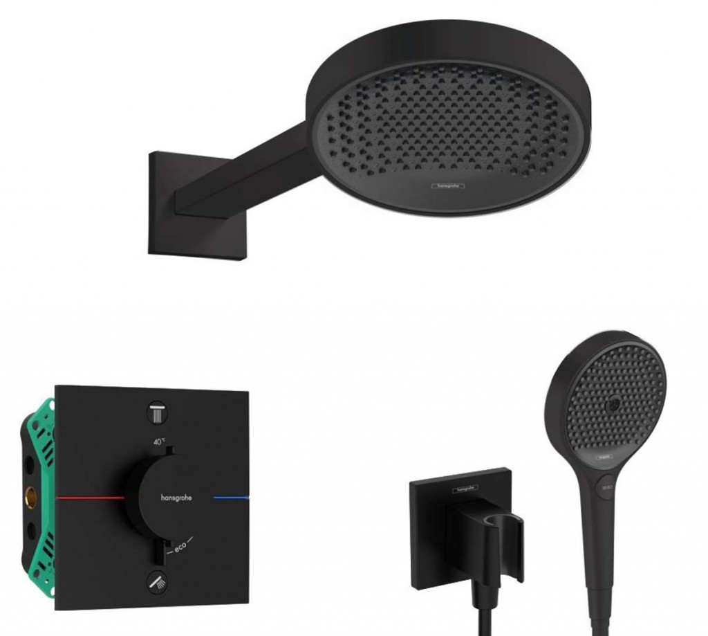 Sprchový set obsahuje: podomítkovou termostatickou baterii ShowerSelect Comfort E, s tělesem barva matná černá rozměr 155 x 155 mm pro 2 spotřebiče současné použití více spotřebičů podomítková montáž na základní těleso zapínání/vypínání pomocí velkého kovového tlačítka Select termostatická kartuše, ventil Select Start/Stop max. průtok 22,1 l/min bezpečnostní pojistka při 40 °C nastavitelné omezení teploty a průtoku možnost termické dezinfekce zpětný ventil dodáváno s tlačítkem Rain malý, Rain velký, ruční sprchu, vodopád, vanu včetně podomítkového tělesa iBox universal 2 horní sprchu Rainfinity barva matná černá povrchová úprava disku vodních paprsků grafitově černá materiál disku vodních paprsků plast průměr 250 mm XXL Performance druh proudu: PowderRain s technologií QuickClean maximální průtok  16 l/min závit přívodu G 1/2" nástěnné sprchové rameno, délka 428 mm Ruční sprchu Rainfinity barva matná černá průměr 132 mm XXL Performance 3 proudy - PowderRain, IntenseRain, MonoRain pohodlná volba proudu tlačítkem Select maximální průtok 14 l/min  s technologií QuickClean závit přívodů G 1/2" Sprchové kolínko s držákem a hadicí barva matná černá materiál plast  dvoudílná konstrukce pevná pozice držáku pro hadice s kónickou maticí se zpětným ventilem připojení G 1/2" plastová hadice, délka 160 cm