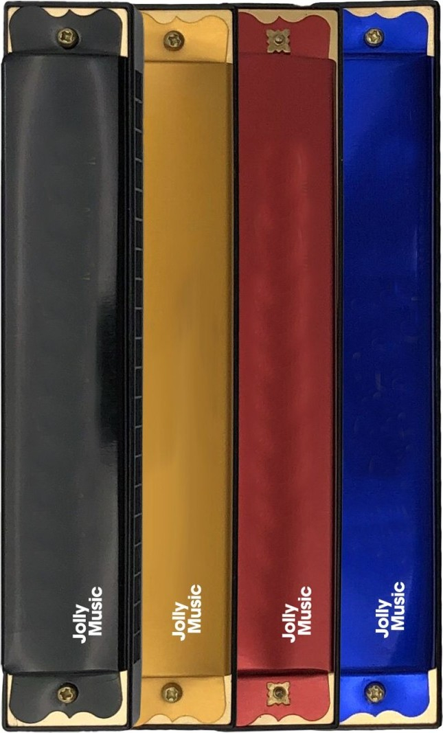 Kovová harmonika ve čtyřech barvách černá, zlatá, červená a modrá. Velikost harmoniky 23 cm.