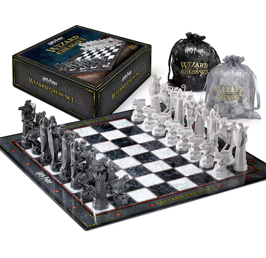 Kouzelnické šachy, se kterými jste se mohli setkat hned v prvním díle Harry Potter a Kámen mudrců. Jedná se o set hrací desky s plastovými figurkami. Velikost figurek od 5 do 12 centimetrů. Rozměr hrací desky 47×47 cm. Hmotnost setu: 1,7 kg Oficiální licence Harry Potter Výrobce: britská společnost Noble Collection