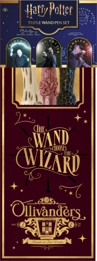 Set propisek ve tvaru kouzelnických hůlek série Harry Potter. Obsahuje vyměnitelnou náplň s černým inkoustem.