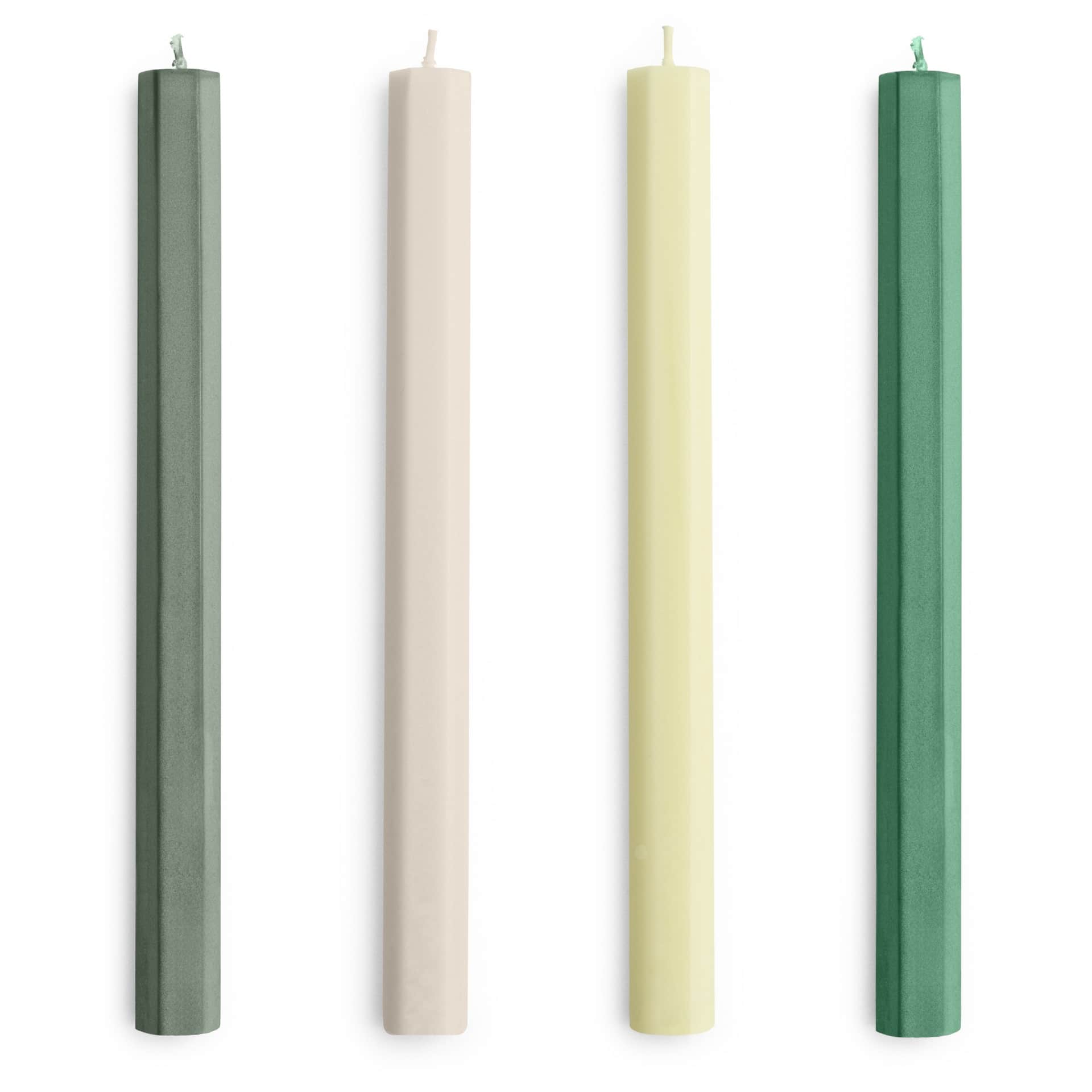 Díky matnému povrchu a geometrickému tvaru vypadají skvěle samostatně i ve skupině. Svíčky mají certifikaci Nordic Swan Ecolabel a mají přibližnou dobu hoření 7 hodin. Tento set čtyř svíček se skládá z odstínů zelené a bílé, které zútulní deštivé podzimní dny. průměr 2,2 cm / výška 24 cm Vyrobeno ze stearinového vosku s certifikací Nordic Swan Ecolabel.