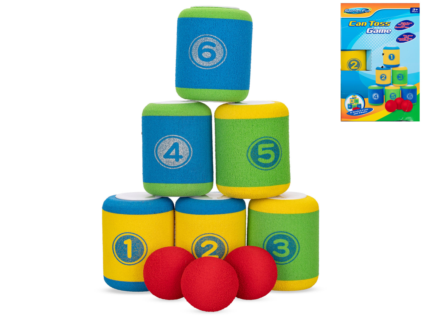 Házecí hra shoď plechovky 6ks s míčkem 3ks v krabičce