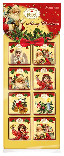 Dárkové balení mléčných mini čokoládek s krásným vánočním motivem 40g Vyrobeno v Německu Mléčná čokoláda (minimální podíl kakaové sušiny 37 % mléčné sušiny: 20 %), Složení: cukr, sušené plnotučné mléko, kakaové máslo, kakaová hmota, emulgátor: sójový lecitin. Může obsahovat stopy skořápkových plodů. Uchovejte v suchu, chraňte před teplem