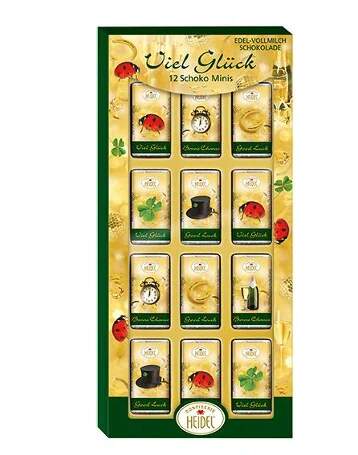Dárkové balení mléčných mini čokoládek s krásným motivem 36g Vyrobeno v Německu Mléčná čokoláda (minimální podíl kakaové sušiny 37 % mléčné sušiny: 20 %), Složení: cukr, sušené plnotučné mléko, kakaové máslo, kakaová hmota, emulgátor: sójový lecitin. Může obsahovat stopy skořápkových plodů. Uchovejte v suchu, chraňte před teplem