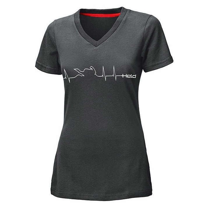 Dámské bavlněné triko Be Heroic s límečkem do V . Pohodlné triko ze 100% bavlny, vpředu s designem srdeční frekvence obsahující siluetu motocyklu, vzadu nahoře s nápisem BE HEROIC. krátký rukáv výstřih do V 100% bavlna černá barva potisk – design Heartbeat Tabulka velikostí Held Péče a materiály Held