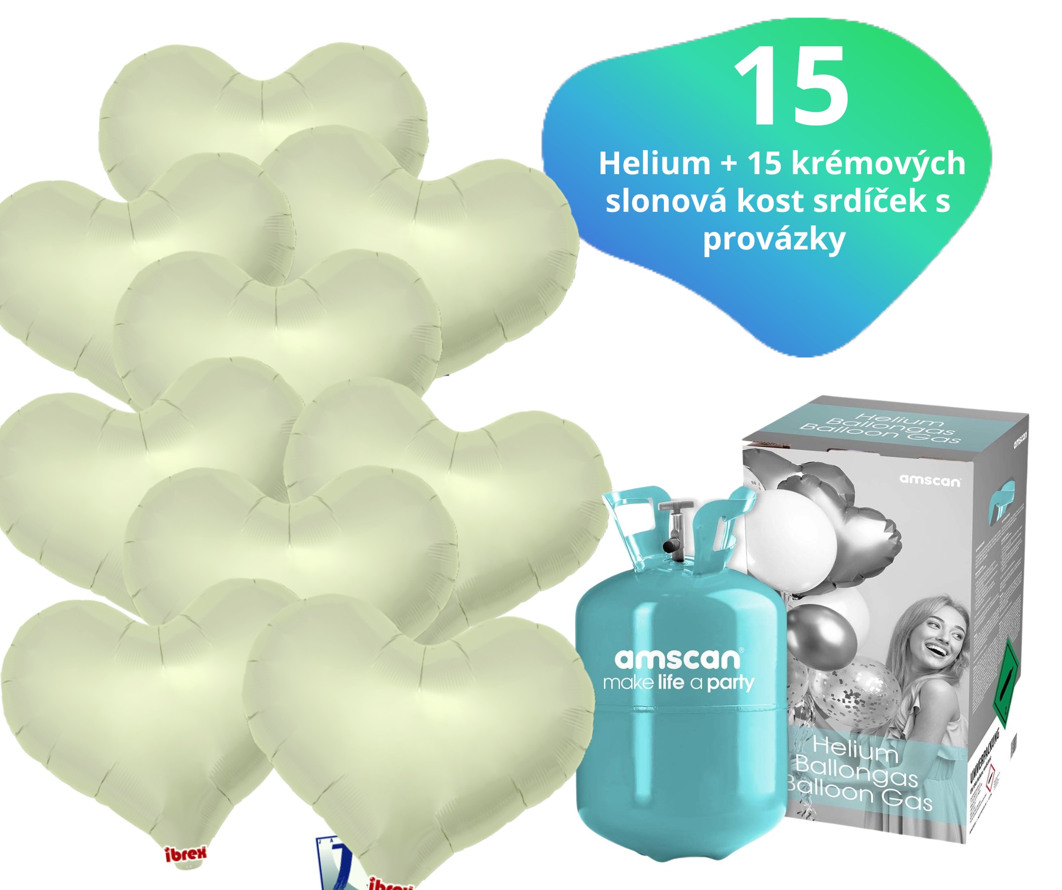 Set obsahuje helium a 15 krémových srdíček IBREX včetně provázků. Je připravený ihned k použití. Létající balónky budou jedinečnou dekorací, která vydrží 30 dní. Doporučujeme jako výzdobu do restaurací, obchodů, dětských koutků, kaváren a jiných provozů, kde návštěvníci ocení hezkou výzdobu interiéru. Záleží pouze na vás, kolik balónkových trsů z balení připravíte. Můžete navázat do trsu 3 balónky a připravit 5 trsů létajících balónků. Dle svých potřeb můžete přidat do objednávky příslušný počet těžítek na balónky. Krémový balónek ve tvaru srdce má průměr 35 cm. Balónek má samouzavíratelný ventil, který ihned po nafouknutí zamezí úniku helia. Objem balónku je 8,6 litrů. Balónek má v nafouknutém stavu rozměr 36 cm x 32 cm. Balónky můžeme potisknout jménem oslavence anebo firemním logem. Další slavnostní výzdobu v krémové barvě najdete v našem e-shopu Balonky.cz v sekci Krémová oslava. Nevypouštějte fóliové balónky naplněné heliem do volné přírody, škodíte tím životnímu prostředí i volně žijícím zvířátkům. Obsah balení: Helium (9053) - 1 kus Balónky IBREX srdíčka (t211512) - 15 ks Stuha na balónky - 15 ks Informace ohledně postupu při likvidaci láhve od helia najdete v článku Likvidace prázdné láhve. Láhev s héliem je pro jedno použití a je nevratná. Design obalu se může lišit dle sezóny a dodavatele.