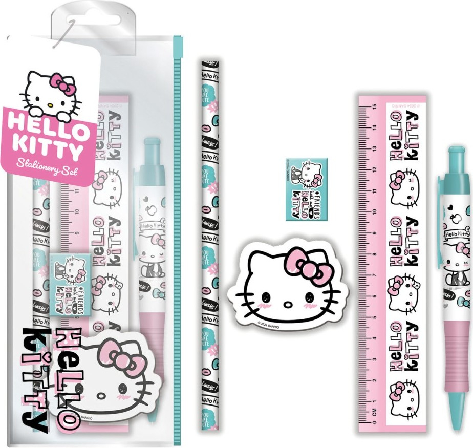 Školní set s roztomilou kočičkou Hello Kitty. Set obsahuje 15 cm pravítko, gumu, pero a tužku.