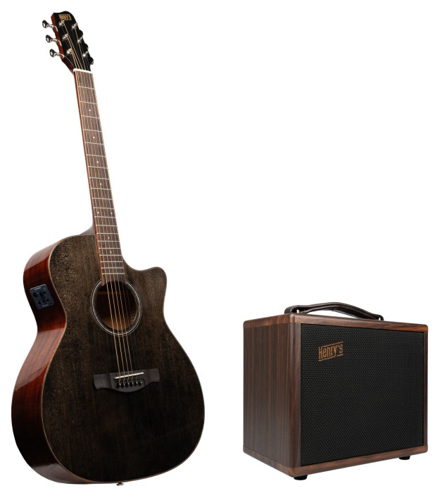 Set ektroakusticé kytary - top: smrk (masiv), zadní deska + luby: mahagon, krk: mahagon, hmatník: vavřín, elektronika: Fishman Presys II, barva: Black, kytarové kombo Henry`s Walker ACA-25W, výkon: 25 W