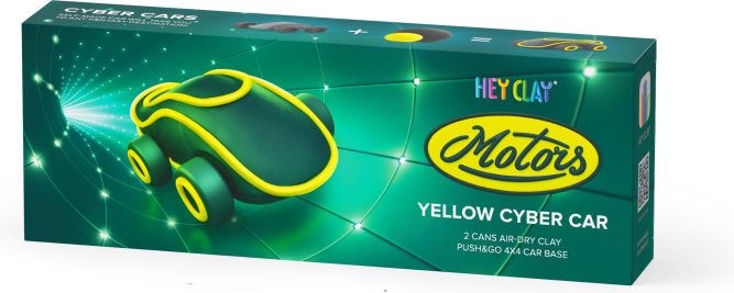 „Cyber auto sada Hey Clay pro vytvoření 1 auta. Obsahuje: 2 kelímky Hey Clay ve 2 barvách (celkem 70 gramů), 1 podstavec do auta (plastová kolečka/náprava). Z modelovací hmoty HEY CLAY si děti mohou vytvořit nepřeberné množství různých postaviček, zvířátek, oblíbených hrdinů anebo podlehnout své fantazii a tvořit co se jim zachce. Po vymodelování je důležité nechat modely na vzduchu dostatečně zatvrdnout a tím okamžikem se mohou stát součástí dalších her a zábavy. Lze si tak jednoduše vytvořit vlastní figurky a postavičky, nebo schovat Hay Clay opět do kelímku pro další tvorbu. S mobilní aplikací Hey Clay (iOS, Android), kterou si zdarma stáhnete, a která nabídne dětem další možnosti rozvíjení fantazie, barev a kouzlení s vytvářením nových postaviček – kód v hodnotě 5USD pro otevření aplikace, najdete v každém balení“
