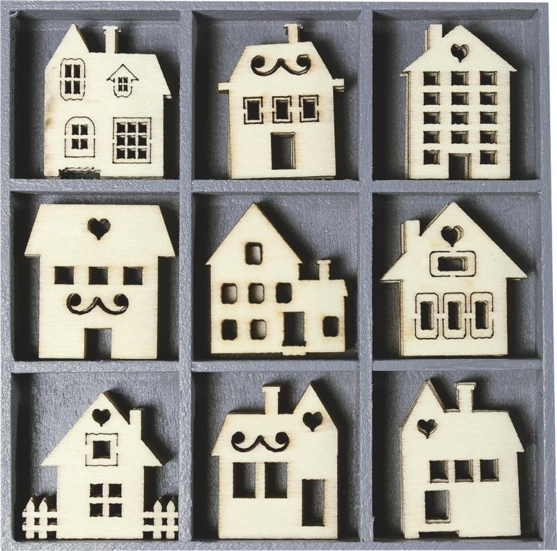 Dřevěné ozdoby v praktickém boxu, 9 motivů po 5 ks. Rozměr jednoho motivu cca 3cm x 3cm. Ideální pro zdobení přáníček, dárků, krabiček apod.