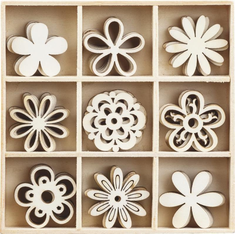 Dřevěné ozdoby v praktickém boxu, 9 motivů po 5 ks. Rozměr jednoho motivu cca 3cm x 3cm. Ideální pro zdobení přáníček, dárků, krabiček apod.