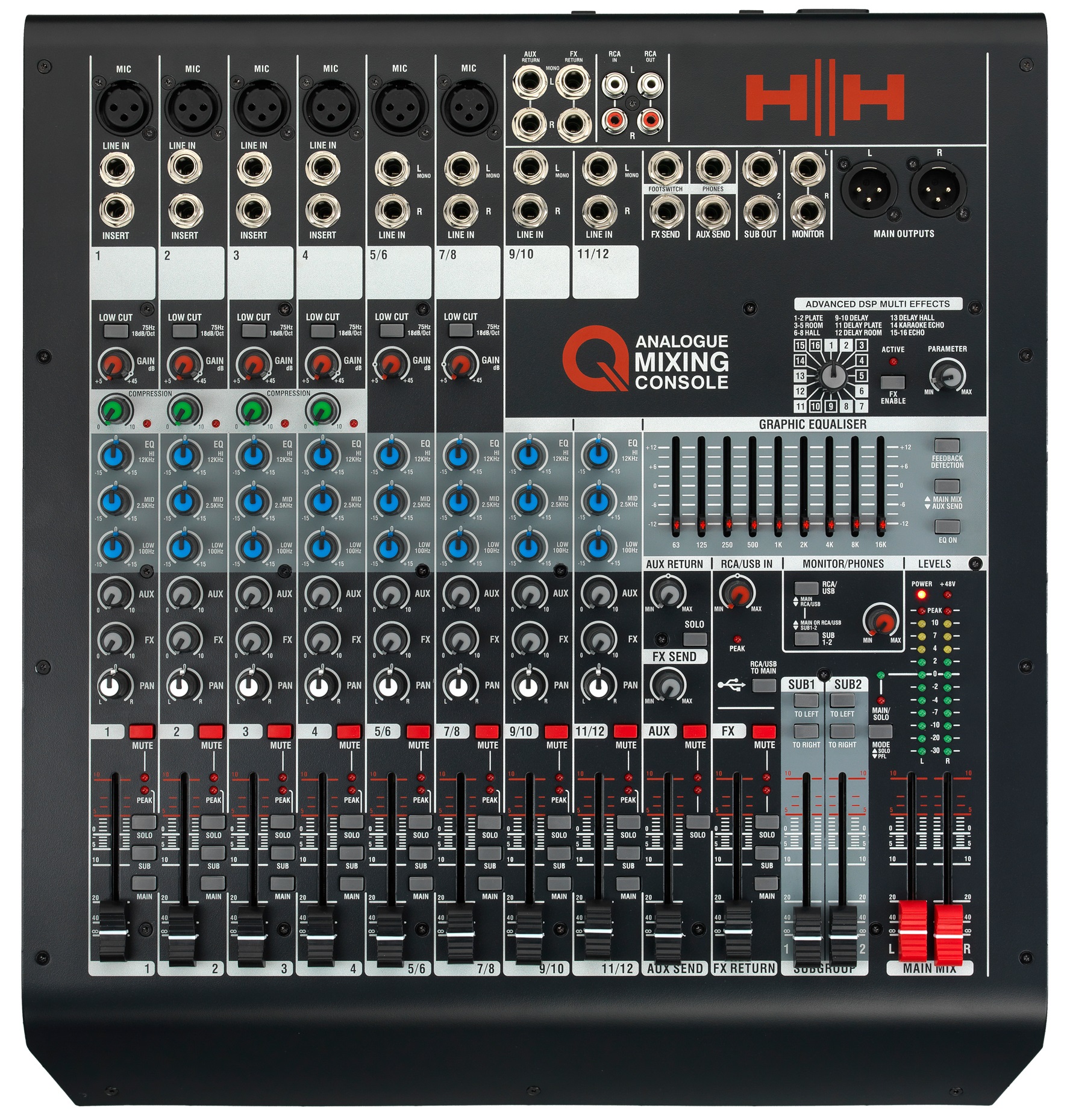 Analogový mixážní pult Analogový mixážní pult H&H Q12FX je kompaktní zařízení s dvanácti kanály, které využijete k ozvučení barů, klubů, malých festivalů, konferencí či přednášek nebo také k nahrávání hudby, podcastů a voiceoverů. Mixpult je osazen šesti mikrofonními XLR vstupy (na kanálech 1, 2, 3, 4, 5/6 a 7/8), které jsou vybaveny předzesilovači s nízkou hladinou šumu, ovladačem Gain pro plynulé nastavení úrovně vstupní citlivosti, jednoduchým low cut filtrem (75 Hz) a globálním fantomov