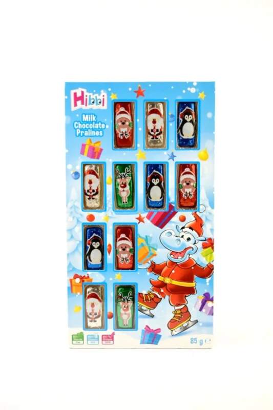 Pralinky z mléčné čokolády v krásném vánočním designu s motivy zvířátek Složení: cukr, kakaové máslo, kakaová hmota, sušené plnotučné mléko, sušené odstředěné mléko, syrovátkový prášek ( z mléka), mléčný tuk, emulgátory ( lecitiny ( ze sóji, polyglycerol, polyricinoleát), ořechová pasta ( lískové ořechy, arašídy), vanilkový extrakt. Kakaová hmota minimálně 30%, mléčná hmota minimálně 14% Výživové hodnoty na 100g : Energetická hodnota : 2180 kj / 521 kcal Tuky 29 g z toho nasycené mastné kyseliny 18 g Sacharidy 59 g z toho cukry 59 g Bílkoviny 5,9 g Sůl 0,23 g Země původu: Polsko Obsah : 85 g Rozměry: Výška 29 cm x šířka 16 cm x hloubka 1,2 cm Alergeny v textu jsou vyznačeny tučně.