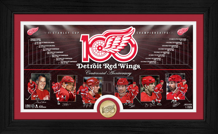 Popis Oslavte 100 let historie Detroit Red Wings s touto limitovanou edicí Timeline Photo Mint o velikosti 12" × 20". V černém dřevěném rámu s dvojitou paspartou a akrylovým sklem je umístěn originální timeline tisk (15" × 7"), který zachycuje nejvýznamnější milníky a ikonické momenty klubu od roku 1926. Grafika představuje legendy Red Wings jako Gordie Howe, Steve Yzerman, Sergei Fedorov, Nick Lidström, Brendan Shanahan a Dylan Larkin. Součástí rámu je také 39mm bronzová mince k 100. výročí Detroit Red Wings s oficiálním výročním logem. Limitovaná edice: 2 026 číslovaných kusů Součástí balení je certifikát pravosti Rozměr rámu: 12" × 20" Rozměr tisku: 15" × 7" Materiál mince: 39mm pevná bronzová slitina Oficiální licence NHL a NHLPA Vyrobeno v USA společností The Highland Mint. Zakupte produkt Highland Mint Sběratelská plaketa Detroit Red Wings NHL 100th bronze coin Timeline photo mint z kategorie KLUBY NHL | DETROIT RED WINGS od výrobce Highland Mint za cenu 2199,00 Kč.