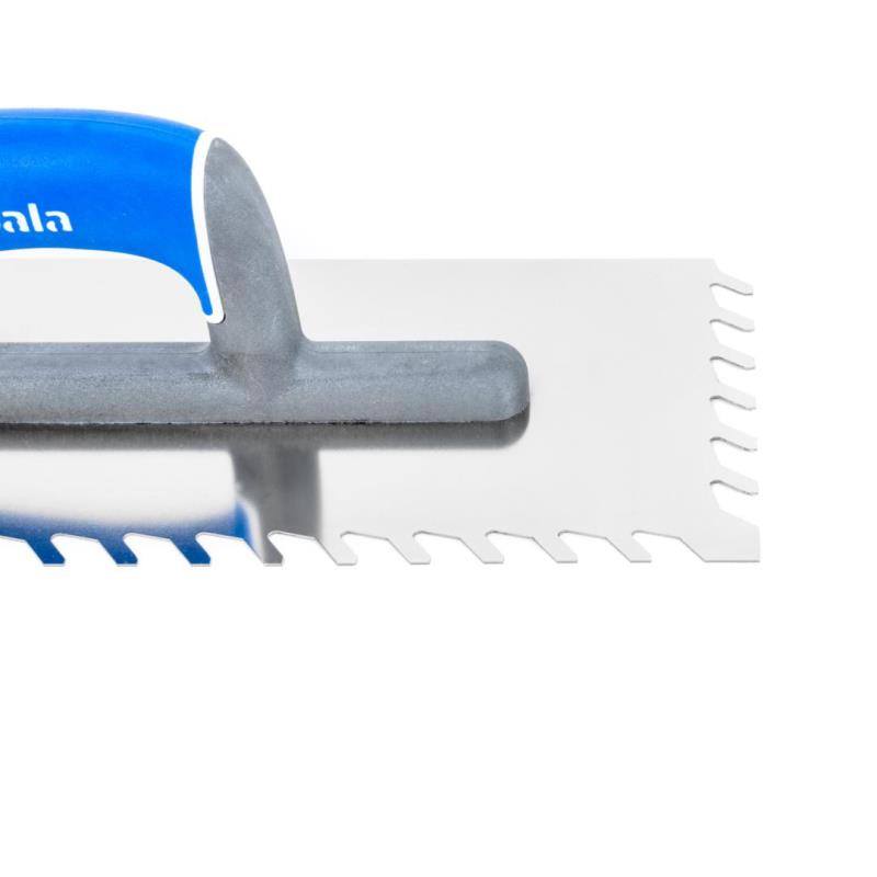 - nerezové hladítko se šikmým zubem, měkká rukojeť na polyamidové noze se skleněným vláknem o rozměru 130 x 270 mm, zub 10 mm