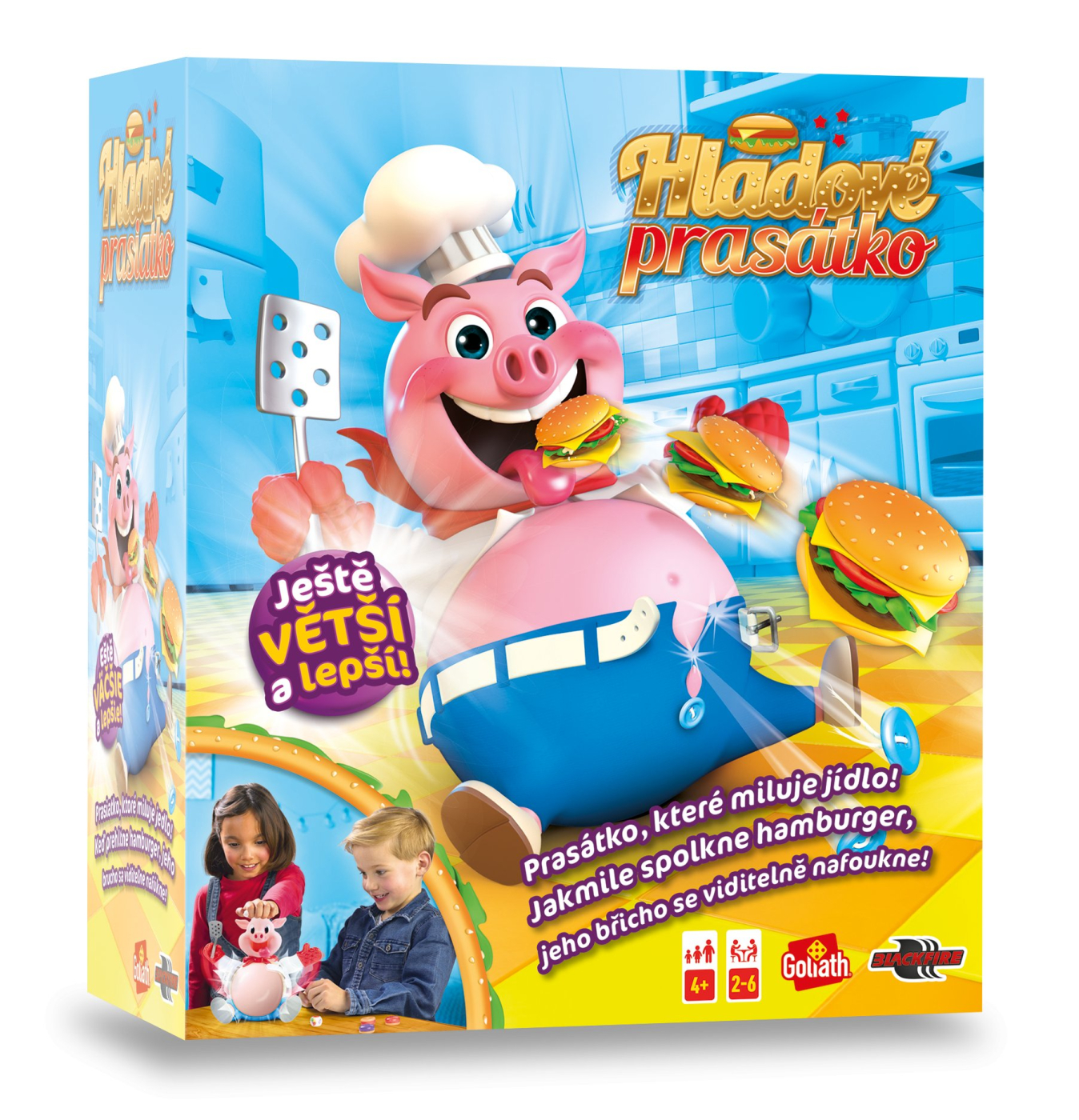 Prasátko, které miluje jídlo! Jakmile spolkne hamburger, jeho břicho se viditelně nafoukne! Cílem hry je nakrmit prasátko tak, až mu praskne opasek u kalhot. Komu prvnímu se to podaří, ten zvítězí ve hře. Jak na hru? 1. Hoďte kostkou a otočte hamburger odpovídající barvy. 2. Stiskněte hlavu prasátka tolikrát, kolikrát bylo uvedeno na hamburgeru. 3. Jeho břicho se nafukuje a nafukuje! 4. Když toho prasátko sní tolik, až mu praskne opasek, zvítězíte! Obsah balení: 1 hladové prasátko 16 hamburgerů 1 kostka 1 česká a slovenská pravidla hry