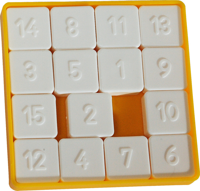 Úkolem je sestavit přesunováním čísla v krabičce do řady od 1 do 15, počínaje jedničkou v levém rohu nahoře. Čísla se však nesmí z krabice vyjmout. Věk 5+